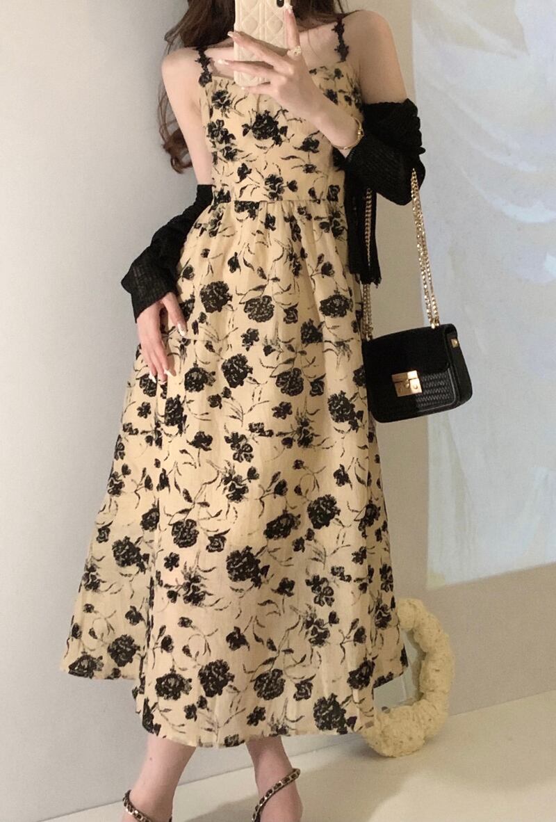 セットアップ チョーカー 付き キャミソール ワンピース カーディガン 2点セット トップス 膝下 ミモレ ミモレ丈 ノースリーブ 長袖 Vネック Aライン ハイウエスト 前開き 透け感 伸縮性 ツーピース かわいい 大人可愛い きれいめ 大人 上品 おしゃれ お洒落 レトロ 大人女子 主役級 柄 小花柄 フラワー 春 夏 秋 10代 20代 レディース 通勤 学生 通学 デート お出かけ 女子会 休日 旅行 着回し 普段使い 重ね着 韓国 サイズ S M L フリーサイズ 色展開 黒 ブラック 花柄