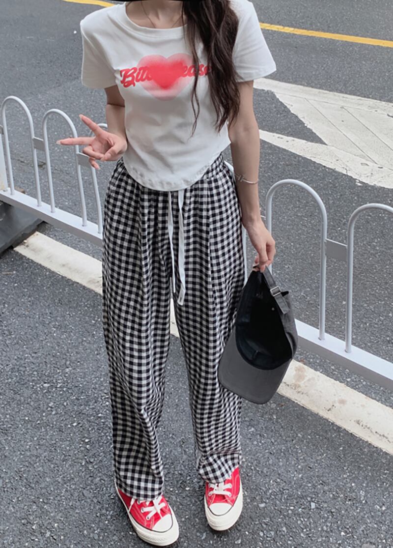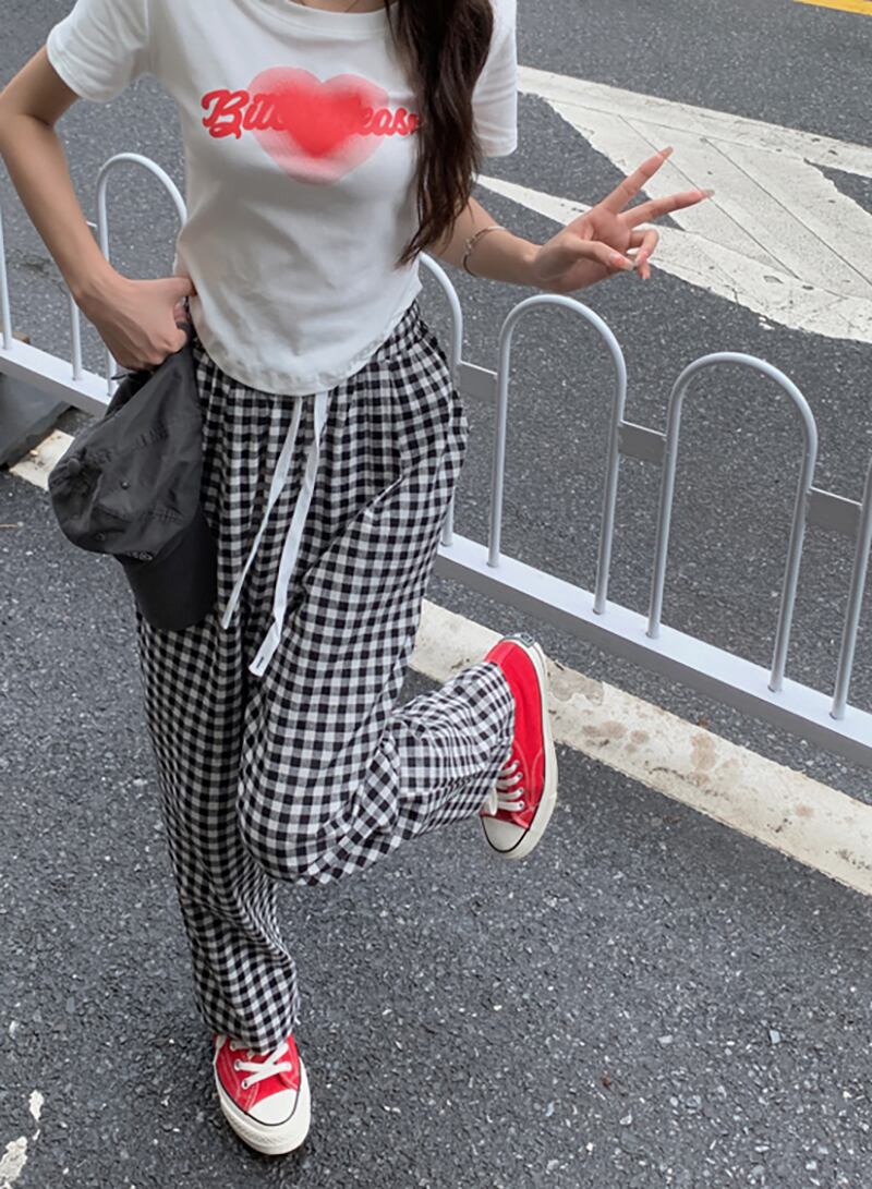 ラフでかわいいチェック柄のハイウエストカジュアルパンツ。
