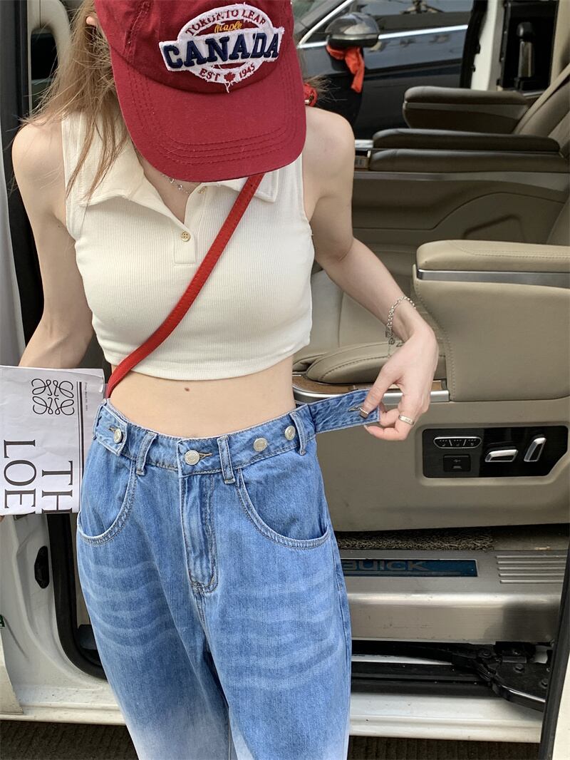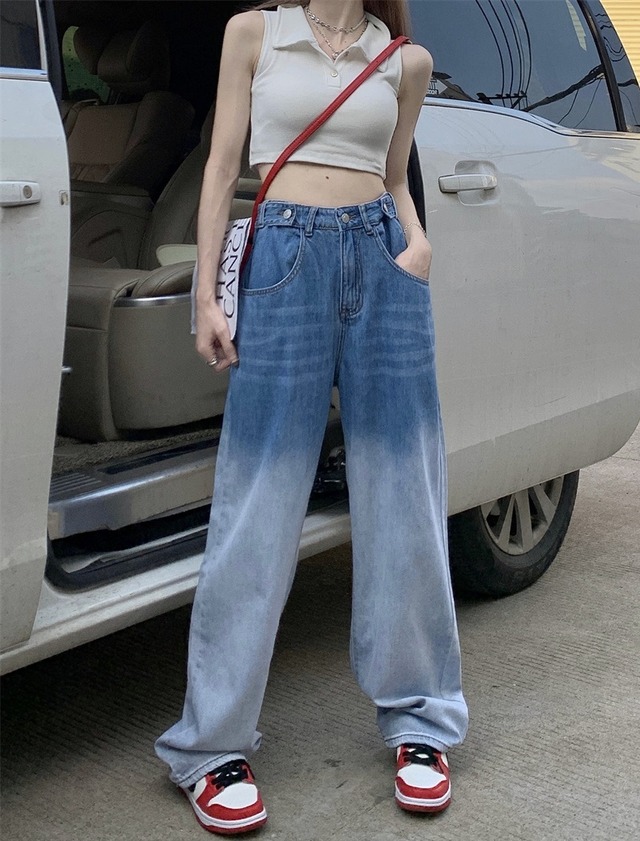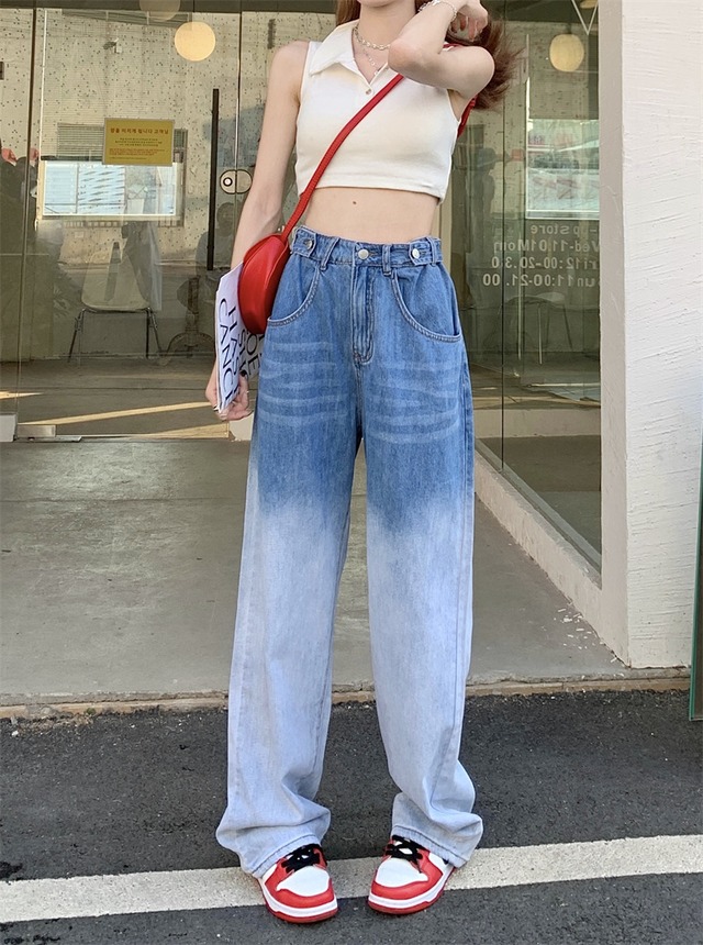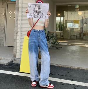 グラデーションカラーが映えるハイウエストのデニムパンツ。