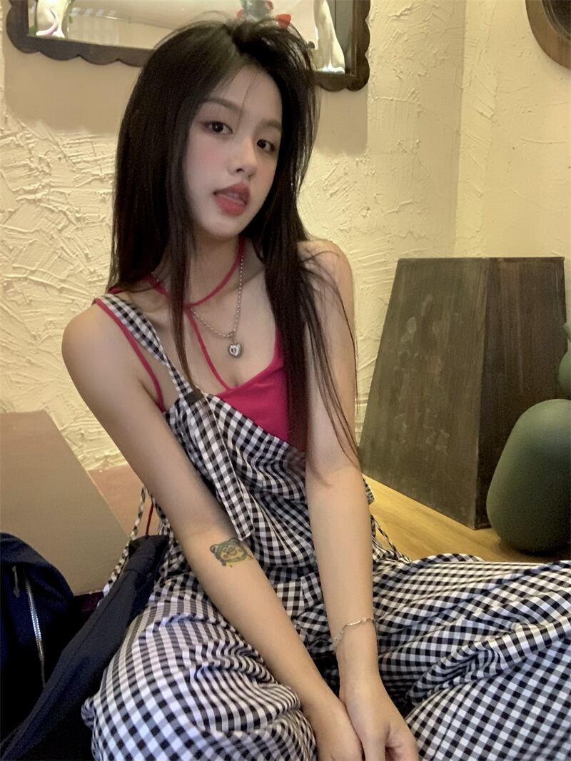 キャミソールとギンガムチェック柄のサロペットの2点セット。