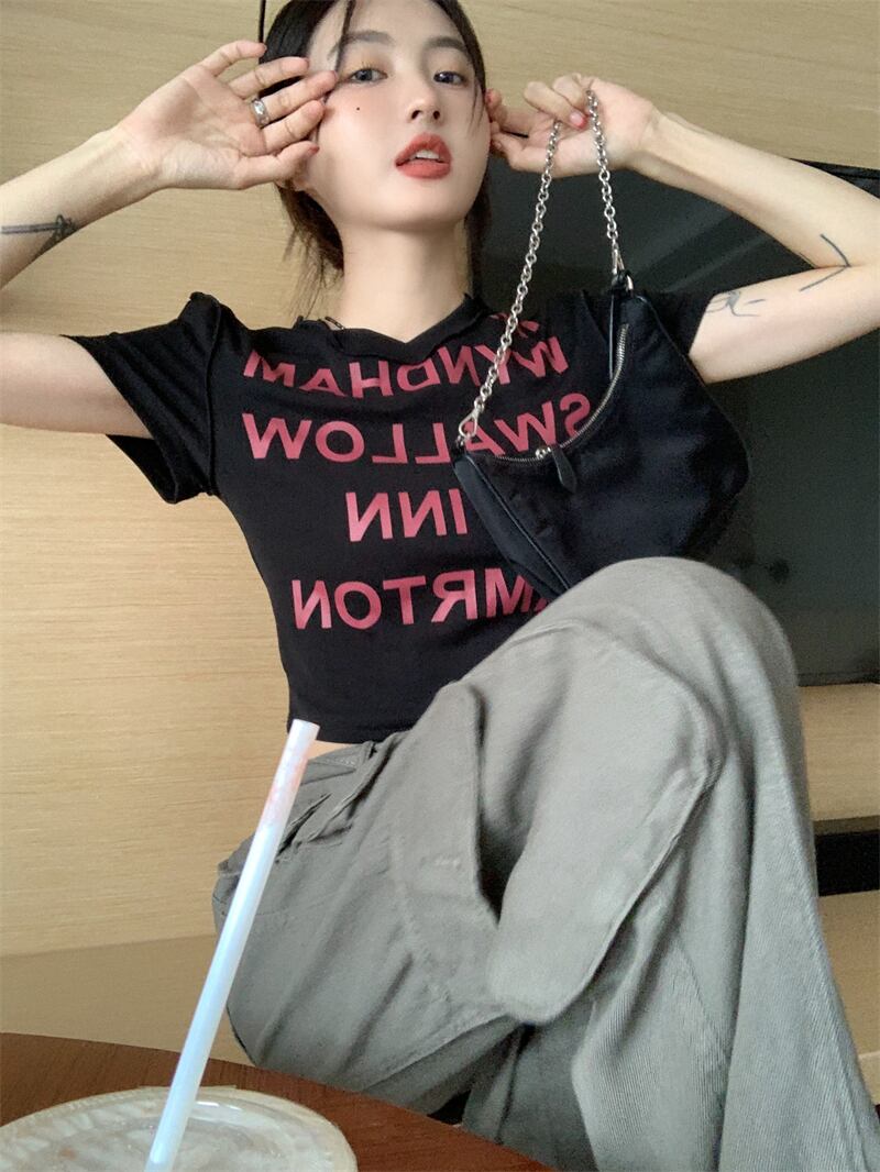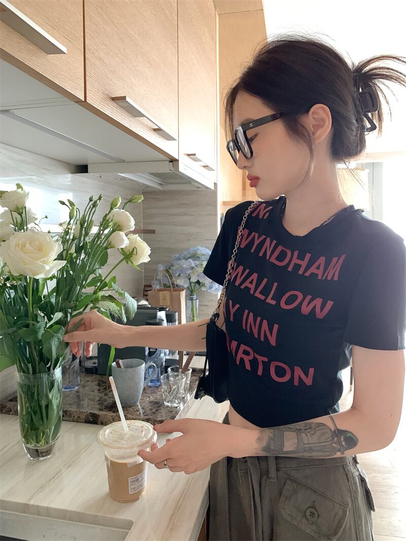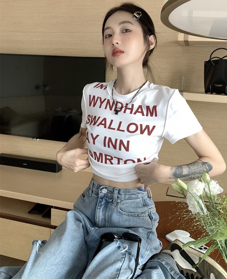 英字 ショート丈 半袖 Tシャツ トップス ショート 袖あり ラウンドネック 襟なし スリム 細身 伸縮性 かわいい 大人可愛い カジュアル 大人 おしゃれ お洒落 大人女子 存在感 柄 ロゴ プリント 夏 10代 20代 レディース 通勤 学生 通学 デート お出かけ 女子会 休日 旅行 着回し 普段使い 重ね着 韓国 韓国系 オルチャン フリーサイズ 色展開 白 ホワイト 黒 ブラック