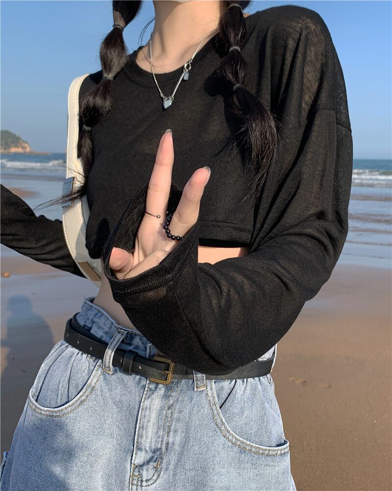 カラバリ 薄手 ショート丈 シアー 長袖 ロンT トップス Tシャツ カットソー ショート 袖あり 長袖 ドロップショルダー 萌袖 ラウンドネック 襟なし 透け感 シースルー かわいい 大人可愛い シンプル カジュアル 大人 おしゃれ お洒落 こなれ感 ルーズ 無地 春 夏 秋 10代 20代 レディース 通勤 学生 通学 デート お出かけ 女子会 休日 旅行 着回し 普段使い 重ね着 韓国 韓国系 オルチャン ゆったり ゆる フリーサイズ 色展開 白 ホワイト 黒 ブラック 青 ブルー
