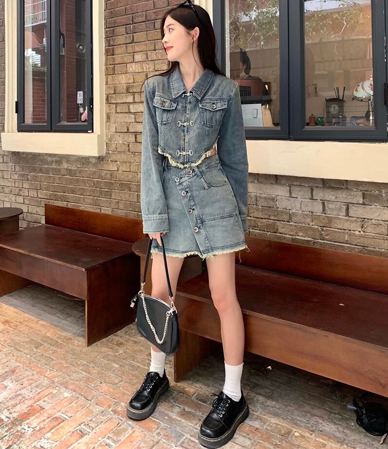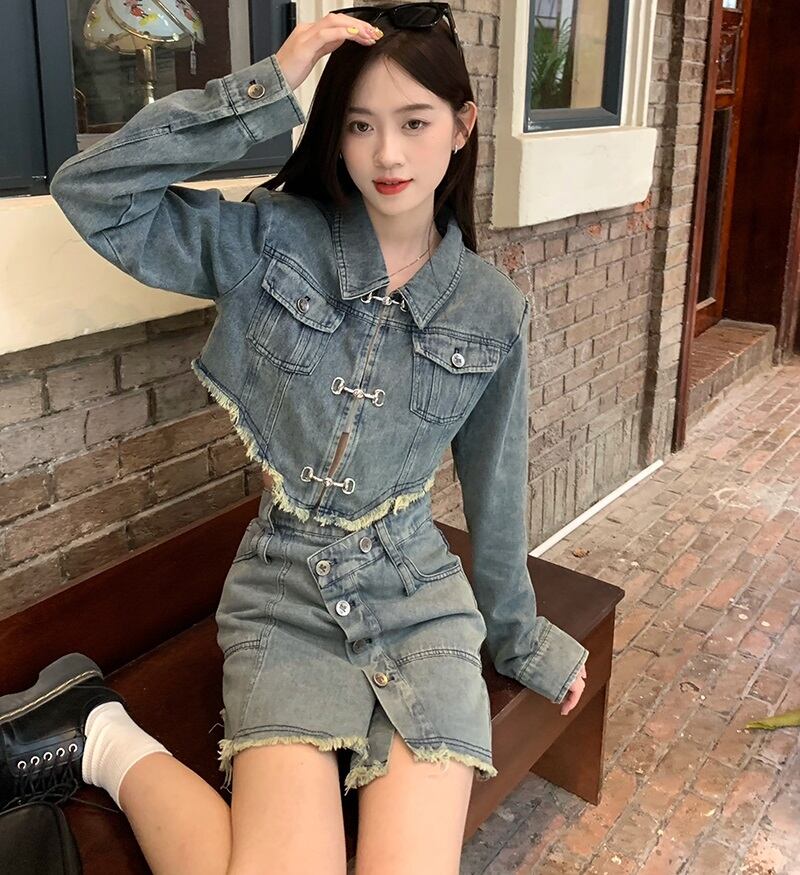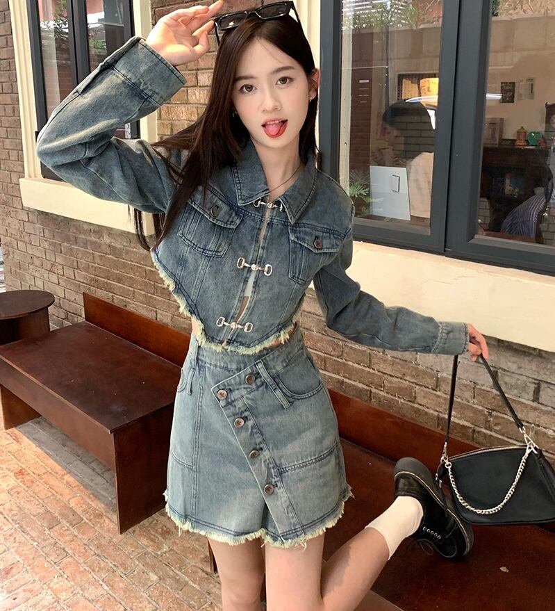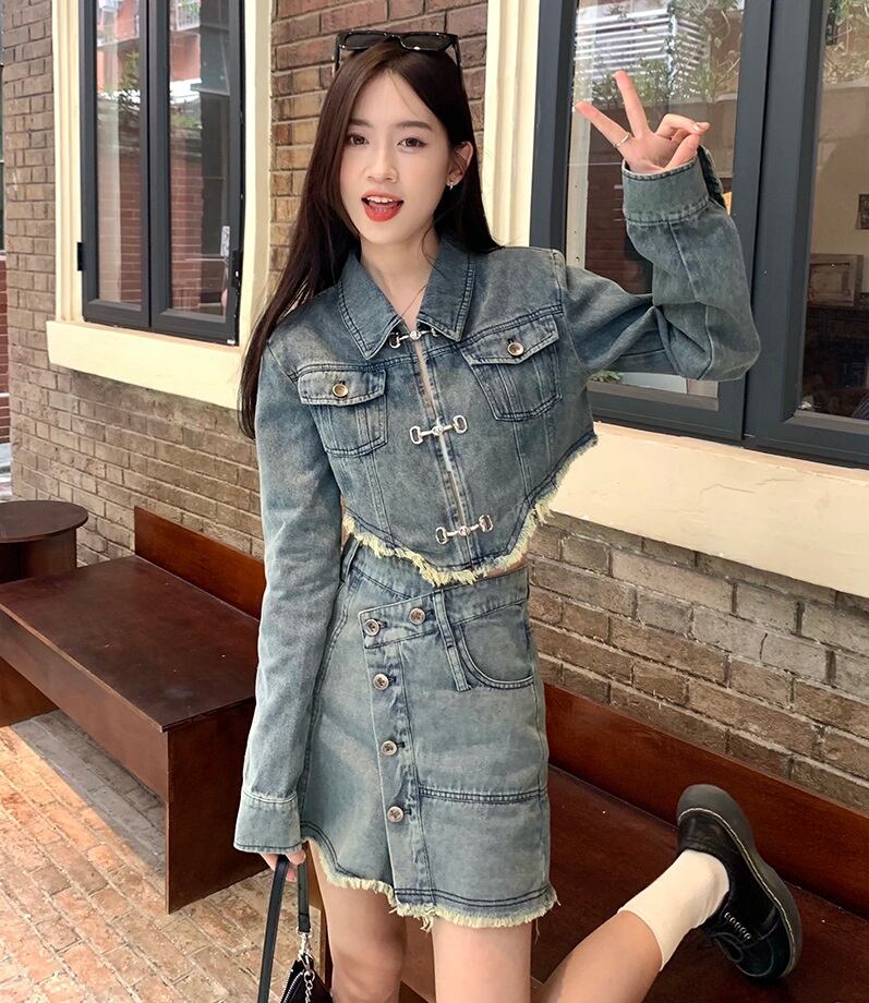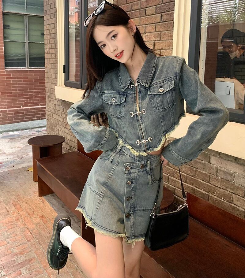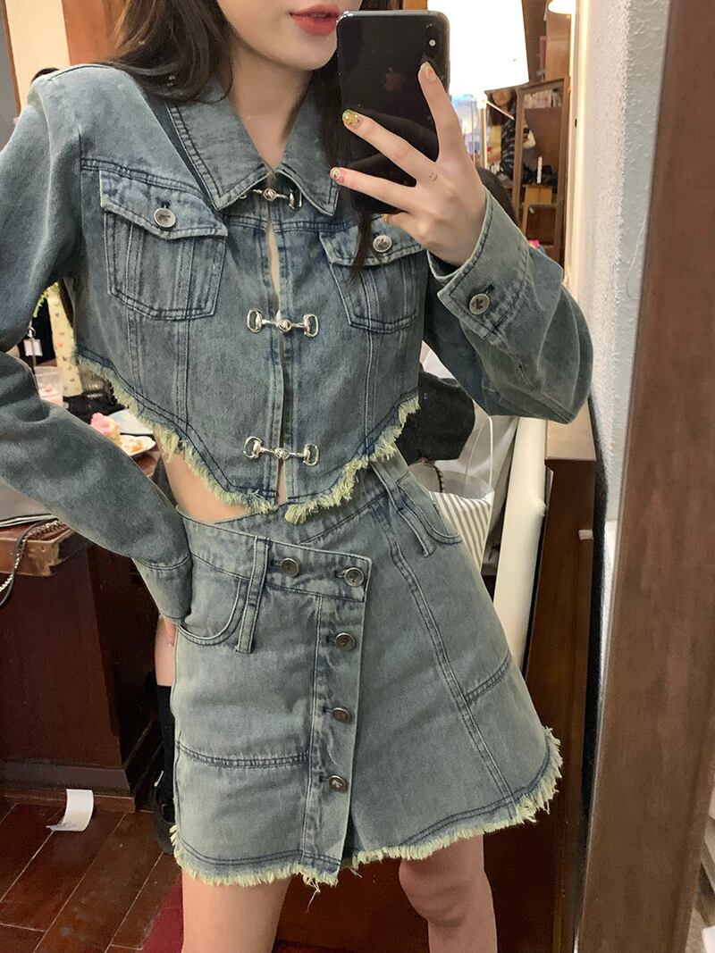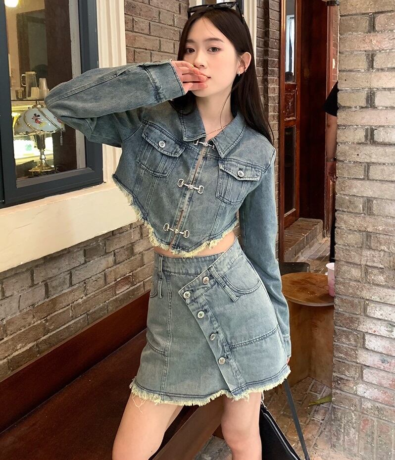 切りっぱなしデニムのショートジャケットとミニスカートのセットアップ。