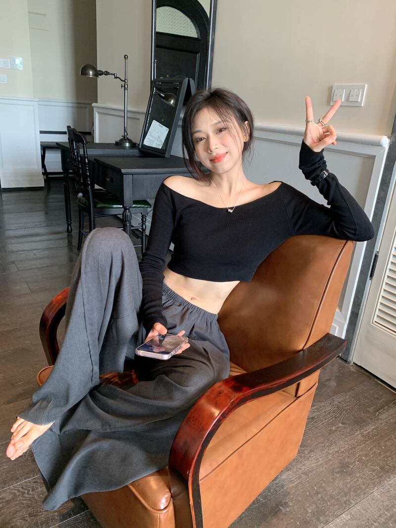 ショート丈のロンTとハイウエストパンツの上下2点セット。