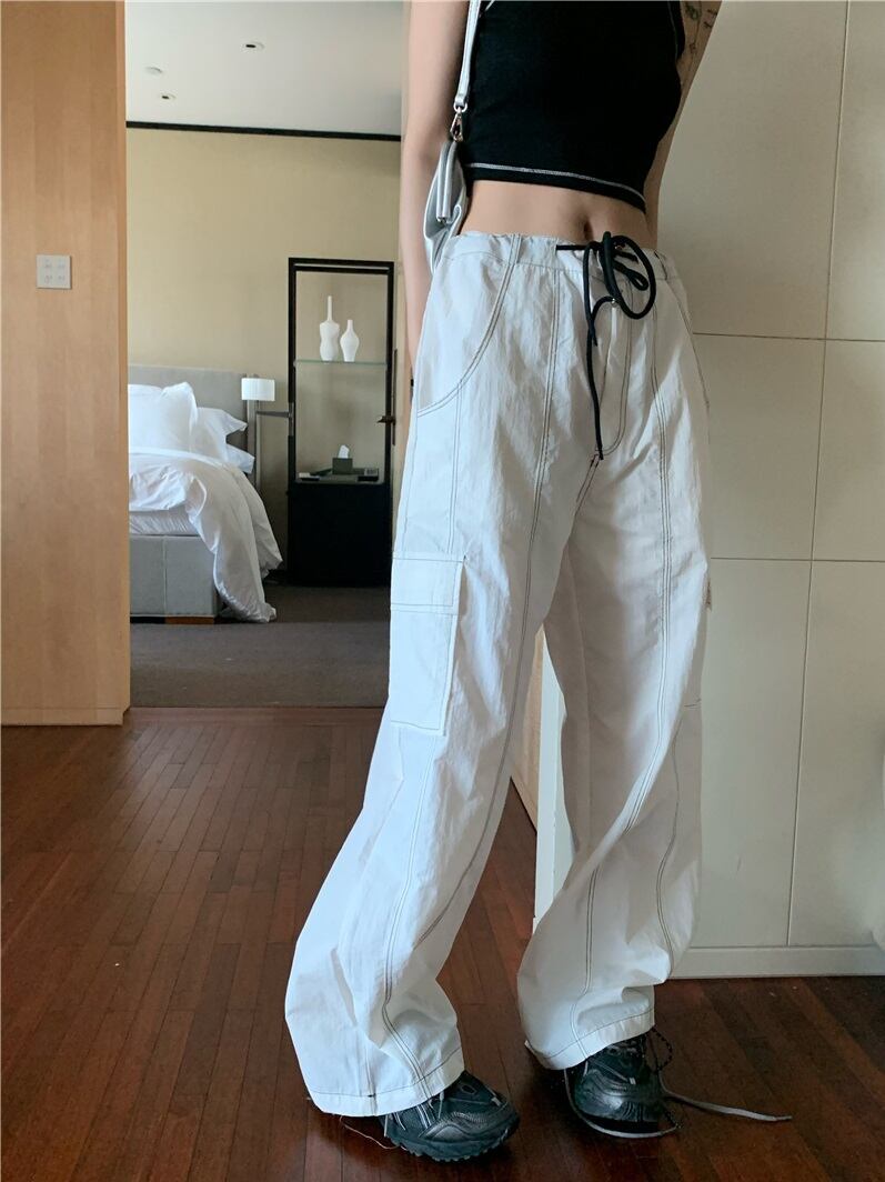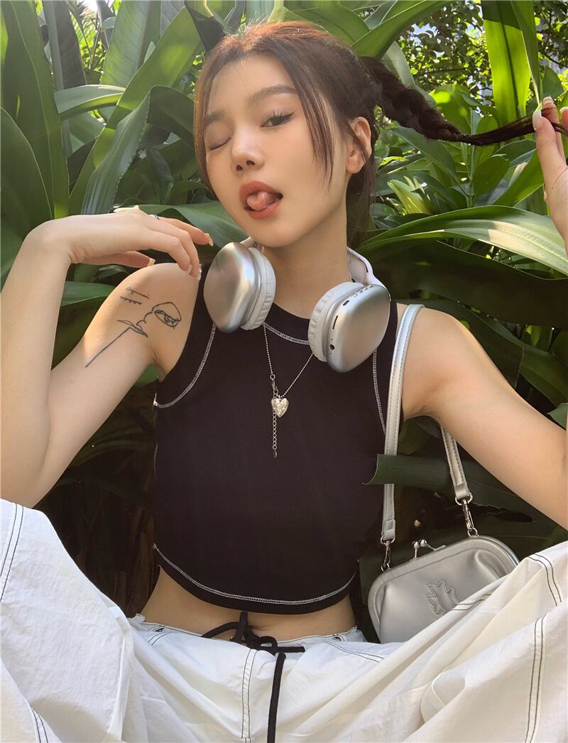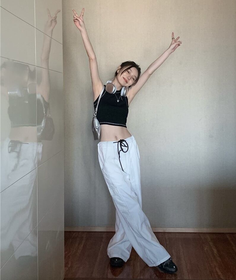 ショート丈のタンクトップとハイウエストパンツのセットアップ。