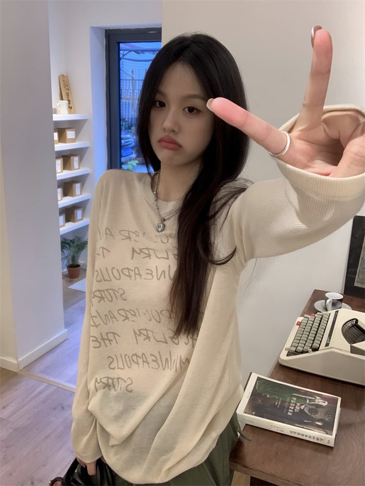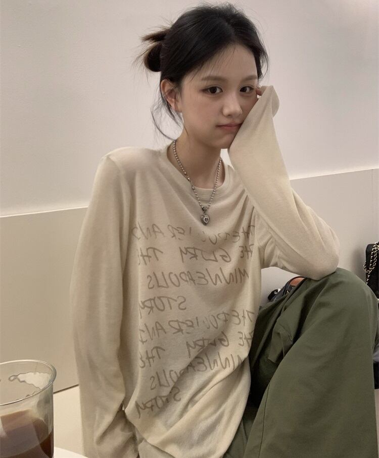 英字 レター プリント ロンT トップス 長袖 Tシャツ カットソー プルオーバー ミディアム丈 袖あり ラウンドネック 襟なし 薄手 かわいい 大人可愛い カジュアル 大人 おしゃれ お洒落 大人女子 ルーズ 柄 ロゴ 春 秋 10代 20代 レディース 通勤 学生 通学 デート お出かけ 女子会 休日 旅行 着回し 普段使い 重ね着 韓国 韓国系 オルチャン ゆったり ゆる フリーサイズ 色展開 アプリコット
