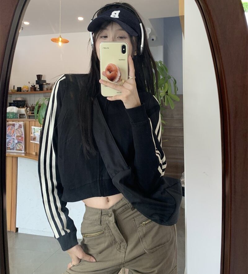 3本ライン ショート丈 長袖 ジップアップ ジャケット トップス 上着 ジャージ ショート 袖あり 襟付き スタンドカラー スリム 細身 ファスナー 前開き 薄手 厚手 かわいい 大人可愛い カジュアル 大人 おしゃれ お洒落 大人女子 こなれ感 スポーティー 柄 ストライプ シマ 春 秋 冬 10代 20代 レディース 通勤 学生 通学 デート お出かけ 女子会 休日 旅行 サイズ S M 色展開 黒 ブラック