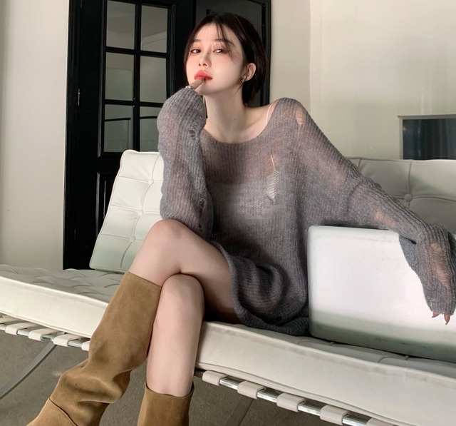 ダメージ加工が施された透かし編み薄手ニットセーター。