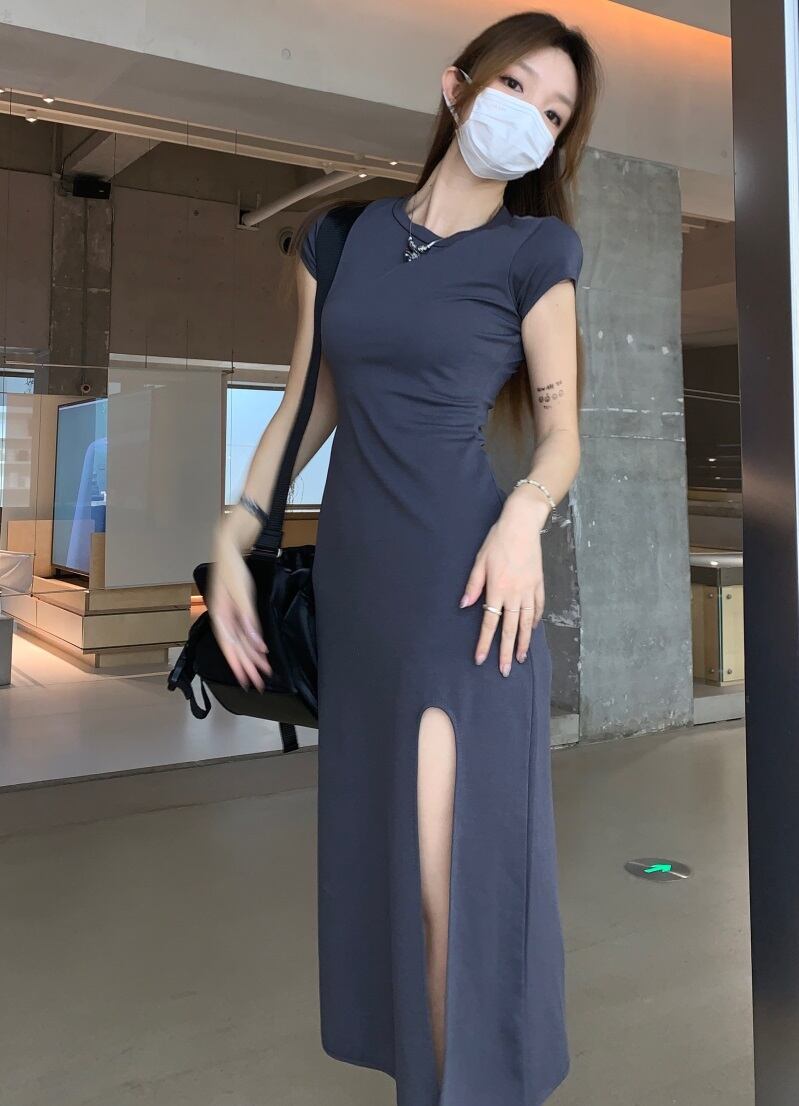深めスリット入り 半袖 ミモレ丈 ワンピース 膝下 ミモレ 袖あり 半袖 ラウンドネック 襟なし スリム 細身 アシンメトリー スリット サイドスリット かわいい 大人可愛い シンプル カジュアル 大人 おしゃれ お洒落 大人女子 ラフ セクシー 無地 春 夏 10代 20代 レディース 通勤 学生 通学 デート お出かけ 女子会 休日 旅行 着回し 普段使い 重ね着 韓国 韓国系 オルチャン 楽ちん 美脚 脚長 サイズ S M 色展開 灰色 グレー