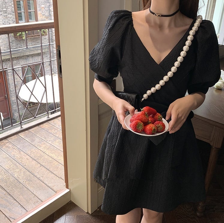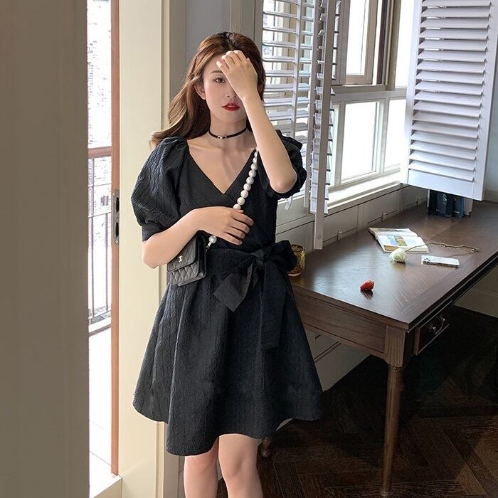 Vネック ウエストリボン ワンピース フレアワンピース ミニ ミニ丈 膝上 袖あり 半袖 パフスリーブ 襟なし フレア スリム 細身 Aライン 切り替えデザイン リボン ウエストマーク ハイウエスト かわいい 大人可愛い カジュアル 大人 おしゃれ お洒落 大人女子 ラブリー キュート ガーリー 主役級 無地 夏 10代 20代 レディース 通勤 学生 通学 デート お出かけ 女子会 休日 着回し 普段使い 重ね着 韓国 韓国系 オルチャン サイズ S M L 色展開 黒 ブラック オフホワイト