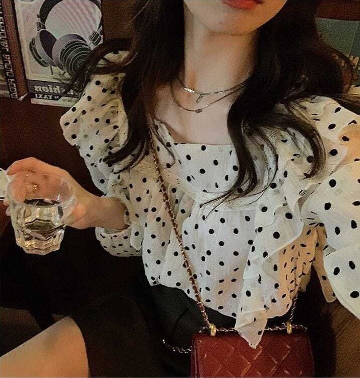 ドット柄 長袖 フリル シフォン ブラウス トップス プルオーバー ミディアム丈 袖あり パフスリーブ スクエアネック 襟なし 透け感 シースルー 薄手 かわいい 大人可愛い カジュアル 大人 おしゃれ お洒落 大人女子 ガーリー 主役級 柄 水玉 春 秋 10代 20代 レディース 通勤 学生 通学 デート お出かけ 女子会 休日 旅行 着回し 普段使い 重ね着 韓国 韓国系 オルチャン ゆったり ゆる サイズ S M L XL 色展開 ドット柄