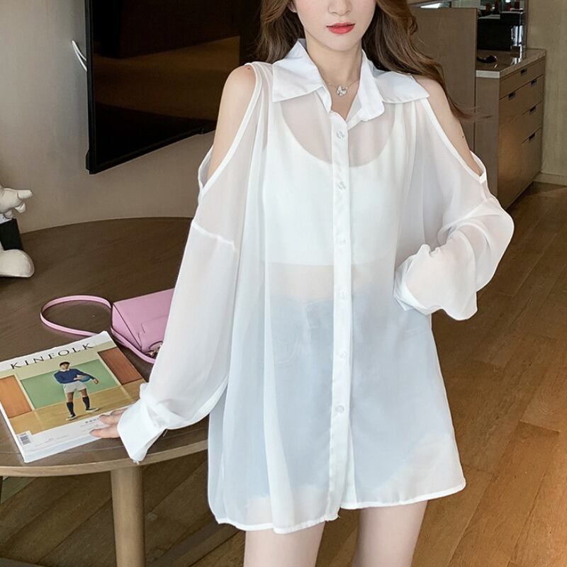 オフショル 長袖 シースルー シャツ トップス 白シャツ 白トップス ミディアム丈 袖あり オフショルダー 襟付き シフォン 前開き 透け感 薄手 かわいい 大人可愛い きれいめ シンプル カジュアル 大人 おしゃれ お洒落 大人女子 こなれ感 ルーズ 個性的 無地 春 秋 10代 20代 レディース 通勤 学生 通学 デート お出かけ 女子会 休日 旅行 着回し 普段使い 重ね着 韓国 オルチャン 穴あき ゆったり 大きいサイズ M L XL 2XL 3XL 4XL 色展開 白 ホワイト 黒 ブラック