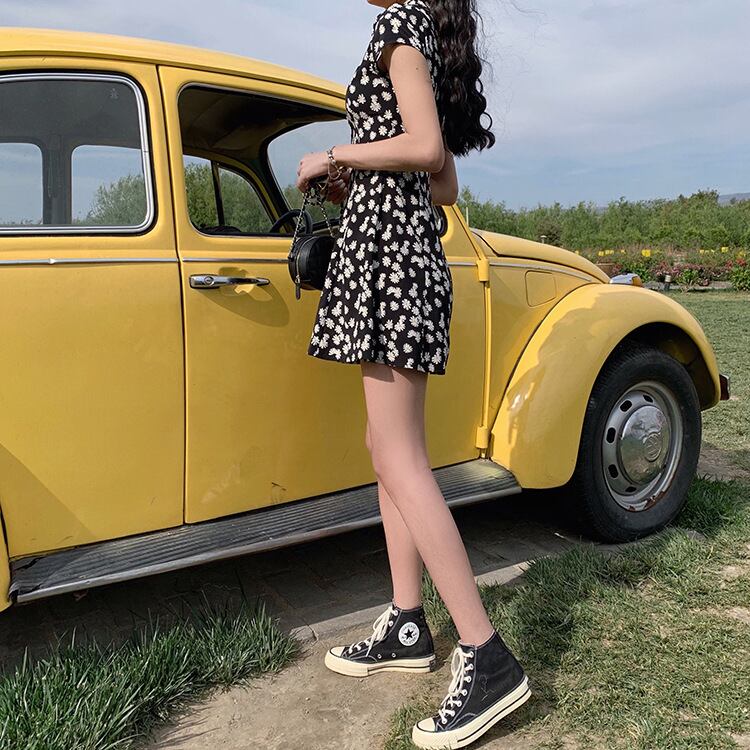 大きめサイズのデイジー柄のレトロガーリーなミニワンピース。