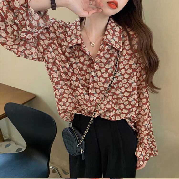 小花柄 長袖 ルーズ シャツ ブラウス トップス ミディアム丈 袖あり 襟付き 前開き かわいい 大人可愛い シンプル カジュアル 大人 おしゃれ お洒落 レトロ 大人女子 こなれ感 存在感 柄 花柄 フラワー 春 秋 10代 20代 レディース 通勤 学生 通学 デート お出かけ 女子会 休日 旅行 着回し 普段使い 重ね着 韓国 韓国系 オルチャン ゆったり ゆる サイズ S M L XL 色展開 赤 レッド