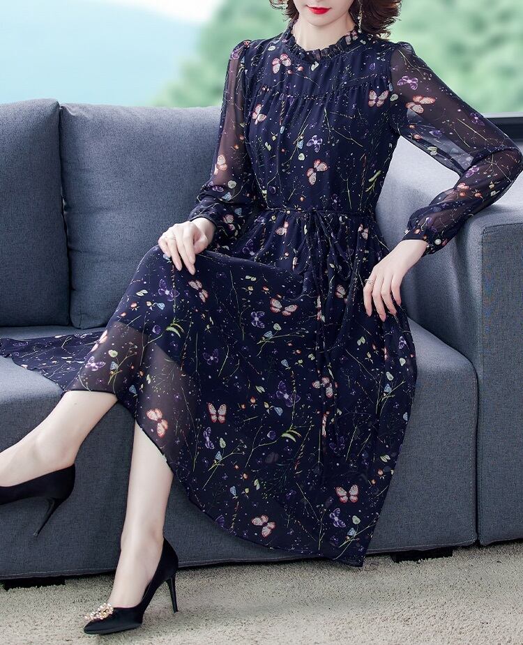 花柄 蝶柄 長袖 ミディアム丈 シフォン ワンピース フレアワンピース ワンピドレス 膝丈 ひざ丈 袖あり 襟付き スタンドカラー スリム Aライン 切り替えデザイン ファスナー ハイウエスト 透け感 シースルー かわいい 大人可愛い きれいめ 大人 上品 おしゃれ お洒落 大人女子 柄 小花柄 春 秋 20代 30代 40代 レディース 通勤 デート お出かけ 女子会 休日 旅行 着回し 普段使い 重ね着 韓国 大きいサイズ S M L XL 2XL 色展開 ピンク ネイビー 水色 ライトブルー