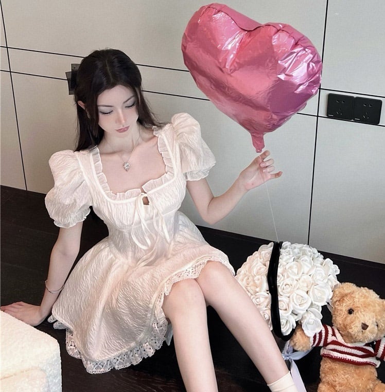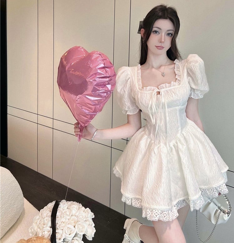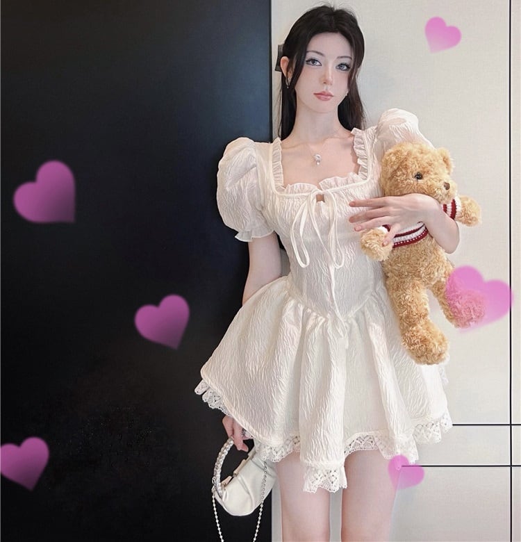 半袖 フリル ミニ ワンピース ドレス 衣装 ミニドレス ワンピドレス ミニ丈 超ミニ 袖あり パフスリーブ スクエアネック 襟なし Aライン スリム 切り替えデザイン フレア 細身 レース リボン ハイウエスト かわいい 大人可愛い カジュアル 大人 上品 おしゃれ お洒落 大人女子 ラブリー キュート ガーリー 主役級 お姫様 お嬢様 無地 10代 20代 レディース 通勤 学生 通学 デート お出かけ 女子会 休日 イベント 旅行 春 夏 秋 サイズ S M L XL 色展開 白 ホワイト