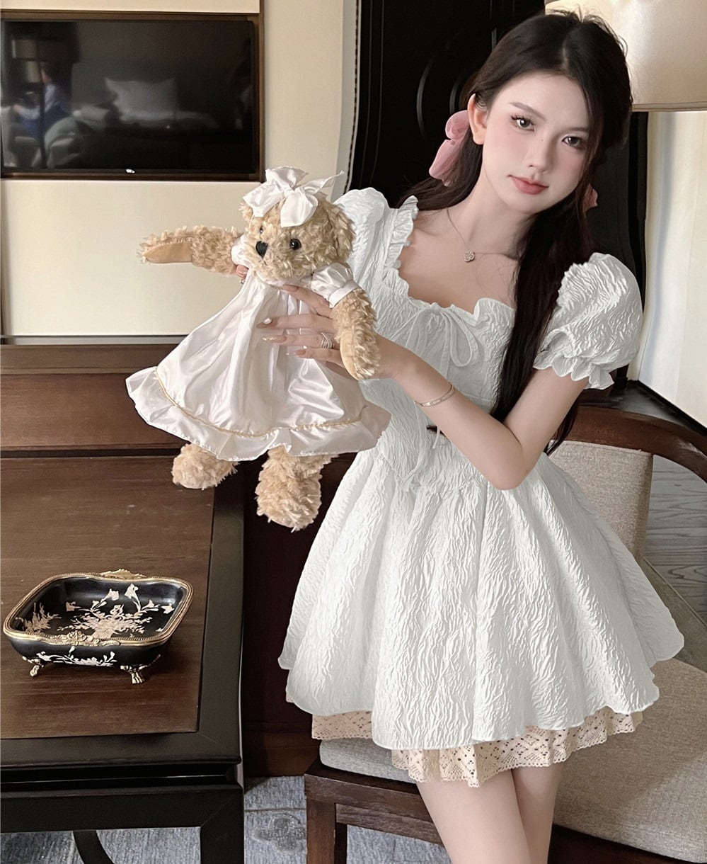 プリンセス フレア ミニ ドレス ワンピース 衣装 ワンピドレス ミニ丈 膝上 袖あり 半袖 パフスリーブ スクエアネック 襟なし Aライン スリム 切り替えデザイン フレア 細身 レース フリル リボン かわいい 上品 おしゃれ お洒落 ラブリー キュート ガーリー 主役級 お姫様 お嬢様 10代 20代 レディース 通勤 学生 通学 デート お出かけ 女子会 休日 旅行 韓国系 オルチャン 春 夏 サイズ S M L 色展開 白 ホワイト ピンク