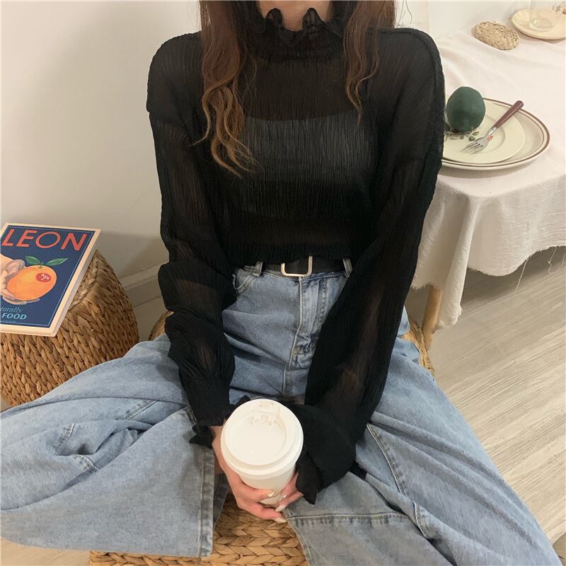 メロウフリル シースルー シフォン シャツ ブラウス トップス インナー ミディアム丈 袖あり 長袖 フレアスリーブ 襟付き ハーフハイネック フリル 透け感 薄手 かわいい 大人可愛い シンプル カジュアル 大人 上品 おしゃれ お洒落 大人女子 ラブリー キュート ガーリー 主役級 無地 春 秋 冬 10代 20代 レディース 通勤 学生 通学 デート お出かけ 女子会 休日 旅行 着回し 普段使い 重ね着 韓国 韓国系 オルチャン モテ ゆったり サイズ S M L XL 色展開