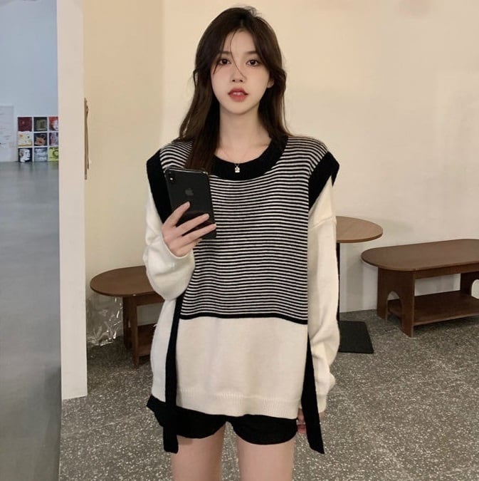 ボーダー柄 レイヤード風 長袖 ニット セーター トップス ミディアム丈 袖あり ラウンドネック 襟なし かわいい 大人可愛い カジュアル 大人 おしゃれ お洒落 大人女子 ルーズ 個性的 柄 ボーダー シマ 春 秋 冬 10代 20代 レディース 通勤 学生 通学 デート お出かけ 女子会 休日 旅行 着回し 普段使い 重ね着 韓国 韓国系 オルチャン ゆったり ゆる サイズ S M L XL 色展開 黒 ブラック