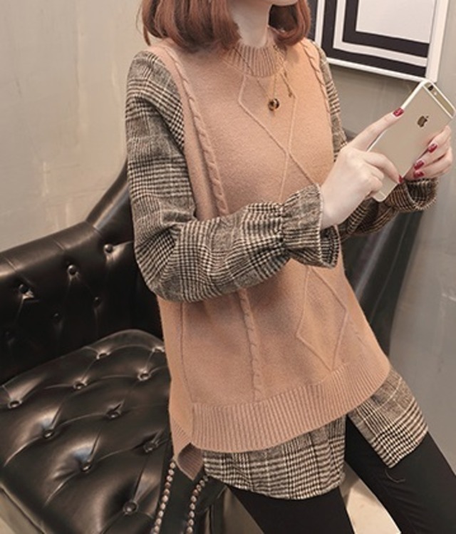 重ね着風 ニット ベスト 長袖 チェック柄 シャツ トップス ミディアム丈 袖あり フレアスリーブ ラウンドネック 襟なし ドッキング 異素材MIX かわいい 大人可愛い カジュアル 大人 おしゃれ お洒落 レトロ 柄 格子柄 春 秋 20代 30代 レディース 通勤 デート お出かけ 女子会 休日 旅行 着回し 普段使い 重ね着 韓国 韓国系 楽ちん 暖かい 体系カバー サイズ S M L XL 色展開 白 ホワイト 黒 ブラック 赤 レッド 青 ブルー 茶色 ピンクブラウン ダークグレー キャメル