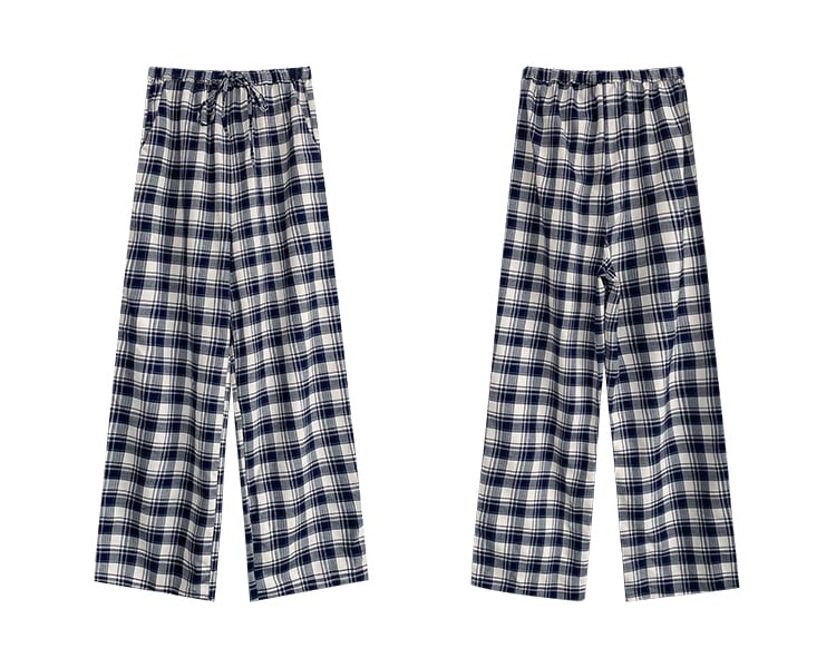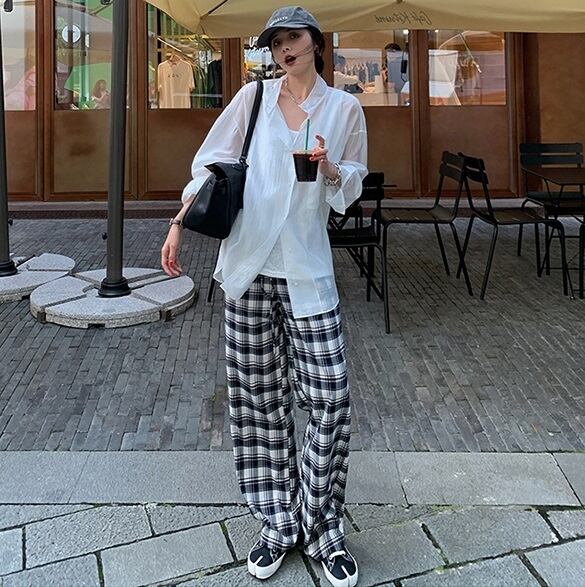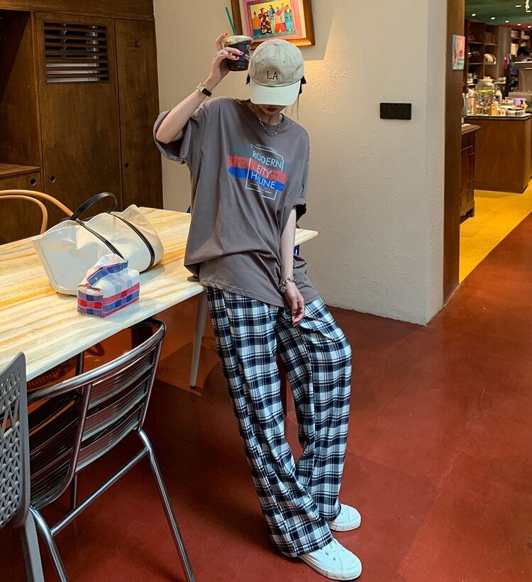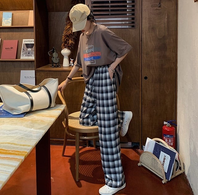 ラフかわいいチェック柄のストレートワイドパンツ。