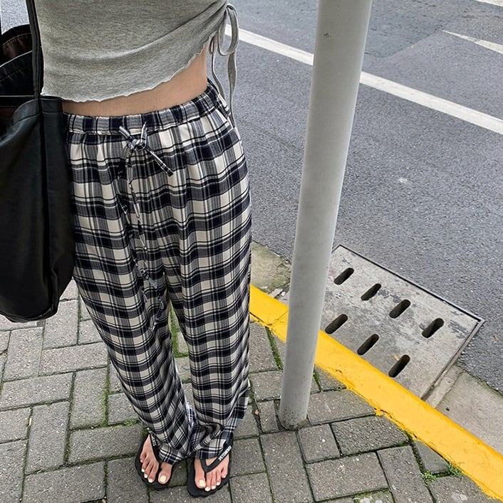 ロング丈 チェック柄 ハイウエスト ワイドパンツ ボトムス パンツ ズボン ストレートパンツ ロング ストレート ワイド リボン ウエストリボン ポケット ウエストゴム 薄手 かわいい 大人可愛い カジュアル 大人 おしゃれ お洒落 大人女子 こなれ感 ラフ ルーズ 個性的 抜け感 柄 格子柄 春 夏 秋 10代 20代 レディース 通勤 学生 通学 デート お出かけ 女子会 休日 旅行 着回し 普段使い 韓国 韓国系 オルチャン 楽ちん 脚長 ゆったり ゆる サイズ S M L 色展開 チェック柄