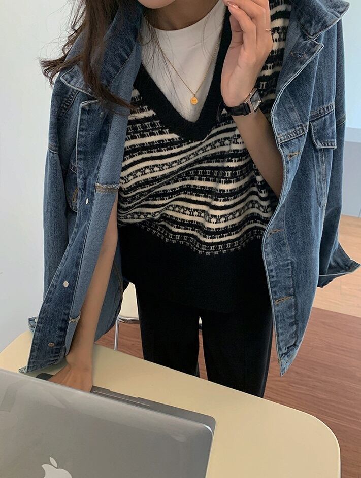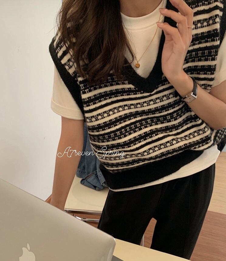 ボーダー柄 Vネック ニットベスト トップス プルオーバー ベスト ミディアム丈 袖なし ノースリーブ 襟なし ニット かわいい 大人可愛い カジュアル 大人 おしゃれ お洒落 大人女子 こなれ感 ルーズ 存在感 柄 ボーダー シマ 春 秋 10代 20代 レディース 通勤 学生 通学 デート お出かけ 女子会 休日 旅行 着回し 普段使い 重ね着 韓国 韓国系 オルチャン ゆったり ゆる フリーサイズ 色展開 白 ホワイト × 黒 ブラック