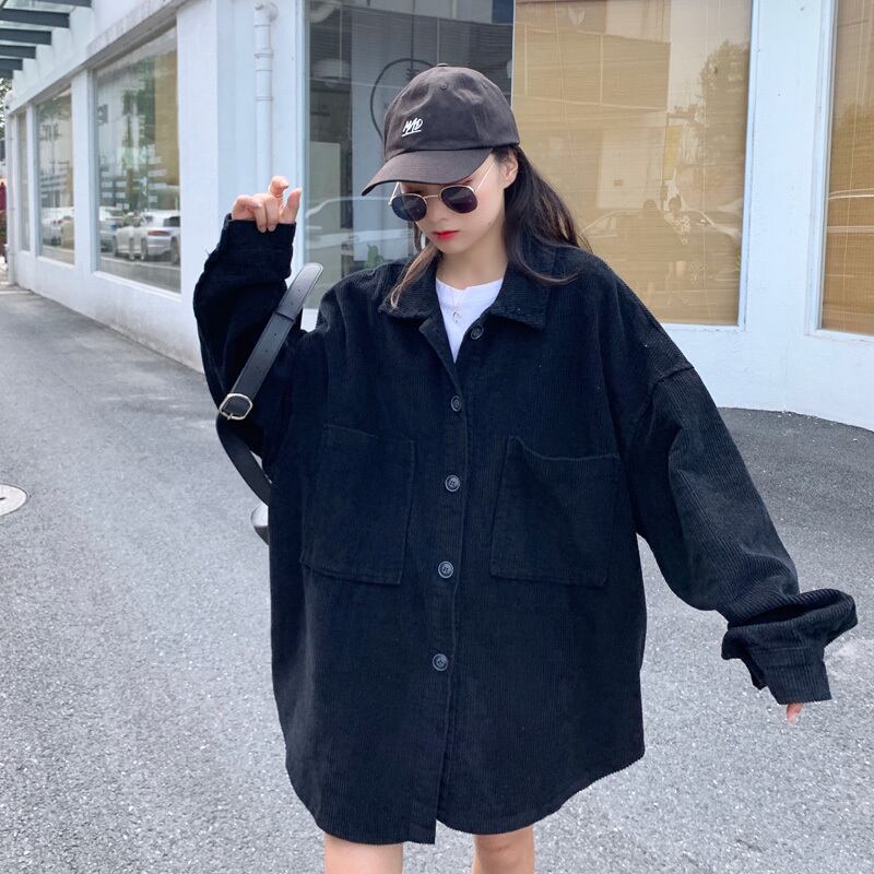 コーデュロイ 長袖 オーバー シャツ ジャケット アウター 上着 ミディアム丈 袖あり 長袖 ボリューム袖 ドロップショルダー 襟付き ポケット 前開き かわいい 大人可愛い シンプル カジュアル 大人 おしゃれ お洒落 かっこいい 大人女子 こなれ感 メンズライク ルーズ 無地 春 秋 10代 20代 レディース 通勤 学生 通学 デート お出かけ 女子会 休日 旅行 着回し 普段使い 重ね着 韓国 韓国系 オルチャン ゆったり ゆる サイズ S M L XL 色展開 黒 ブラック アプリコット