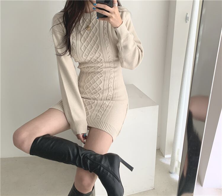 ケーブルニット 長袖 ミニ ワンピース ミニ丈 膝上 袖あり ラウンドネック 襟なし スリム 細身 ハイウエスト ケーブル編み 編み込み ニット かわいい 大人可愛い きれいめ カジュアル 大人 おしゃれ お洒落 大人女子 セクシー 柄 春 秋 冬 10代 20代 レディース 通勤 学生 通学 デート 休日 旅行 着回し 普段使い 重ね着 韓国 韓国系 オルチャン サイズ S M L XL 色展開 黒 ブラック 灰色 グレー アプリコット