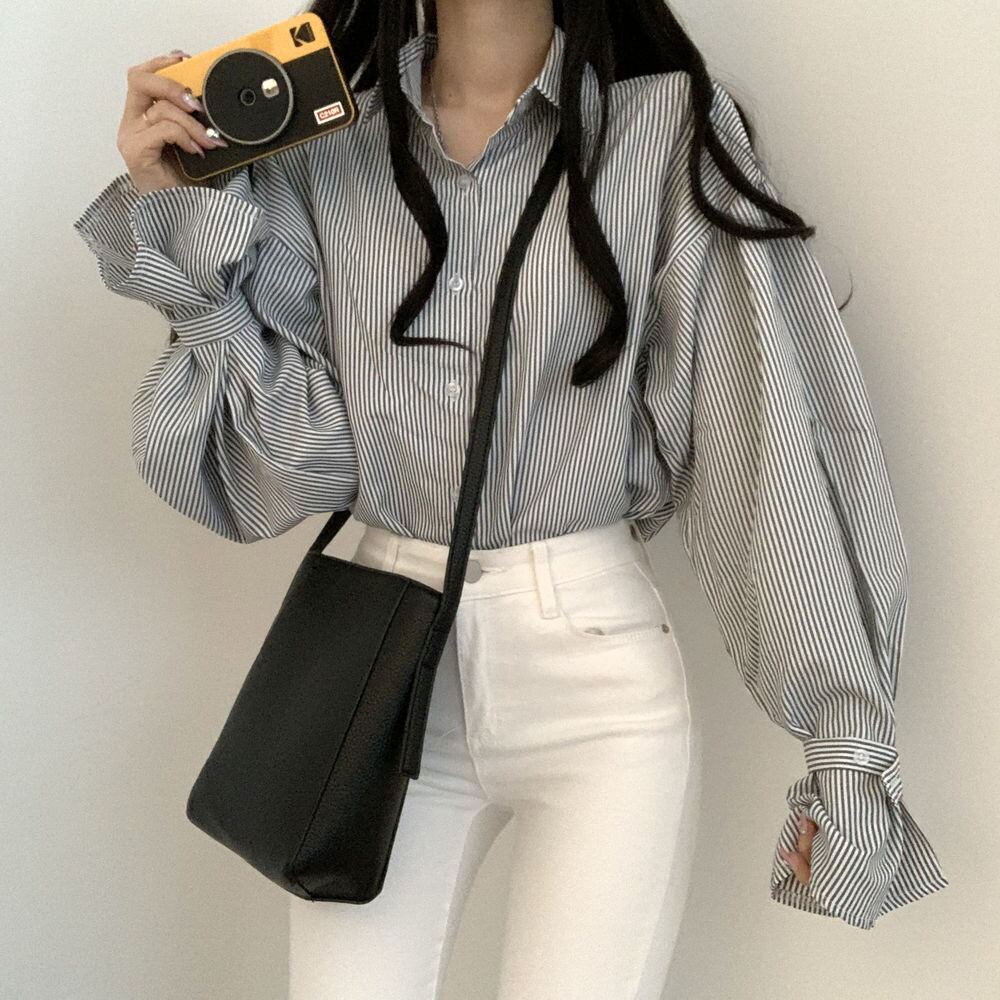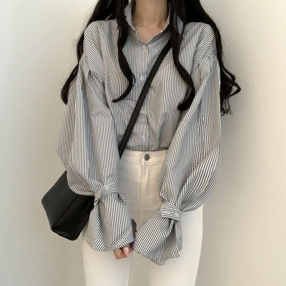 キャンディースリーブ ストライプ シャツ ブラウス トップス ミディアム丈 袖あり 長袖 ボリューム袖 フレアスリーブ 襟付き 前開き かわいい 大人可愛い きれいめ シンプル カジュアル 大人 おしゃれ お洒落 大人女子 ラブリー キュート ガーリー 柄 ストライプ柄 シマ 春 秋 10代 20代 レディース 通勤 学生 通学 デート お出かけ 女子会 休日 旅行 着回し 普段使い 重ね着 韓国 韓国系 オルチャン ゆったり ゆる サイズ S M L XL 色展開 黒 ブラック 青 ブルー