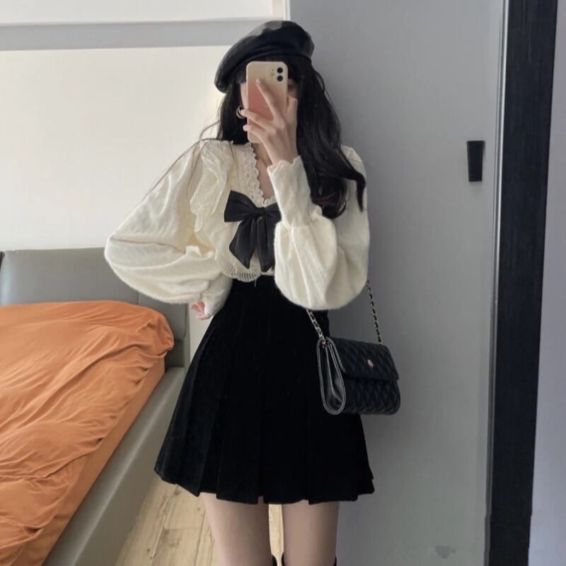 セットアップ リボン ブラウス ミニスカート 2点セット 上下セット トップス スカート ボトムス ミニ ミニ丈 袖あり 長袖 Vネック 襟付き Aライン レース フリル ハイウエスト ツーピース かわいい 大人可愛い シンプル カジュアル 大人 上品 おしゃれ お洒落 大人女子 ラブリー ガーリー 主役級 無地 春 秋 10代 20代 レディース 通勤 学生 通学 デート お出かけ 女子会 休日 旅行 着回し 普段使い 重ね着 韓国 サイズ S M L フリーサイズ 色展開 白 ホワイト 黒 ブラック