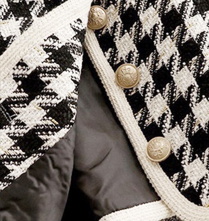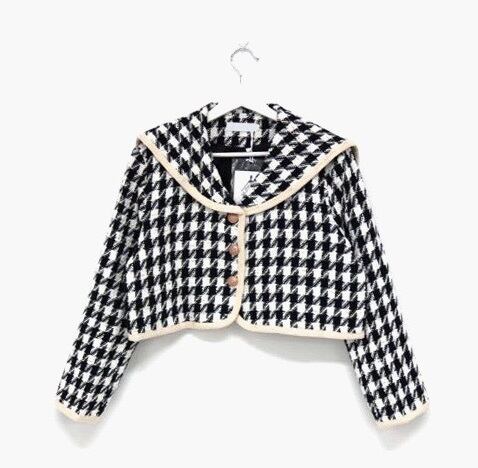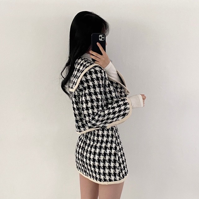 千鳥格子柄の大きめ襟ジャケットとミニスカートの2点セット。