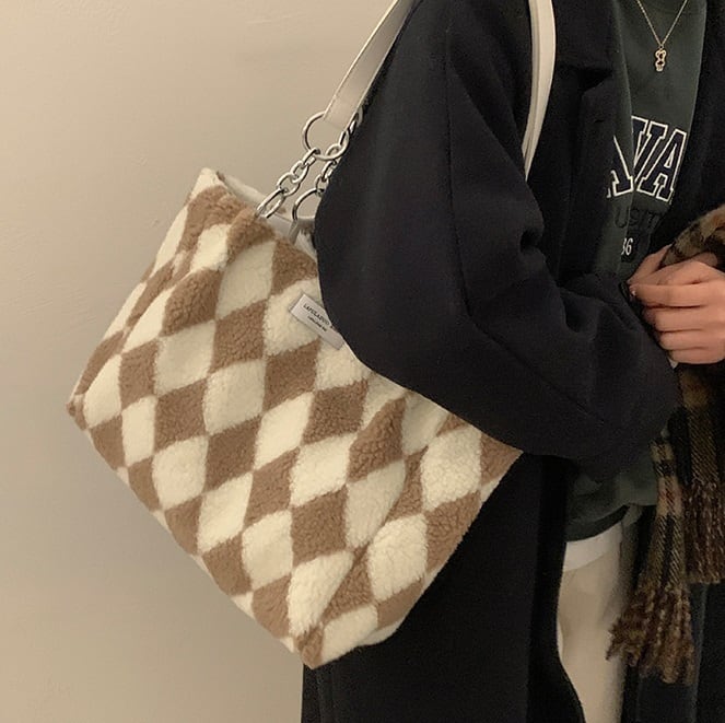 大容量 チェック柄 もこもこ チェーン トートバッグ バッグ バック カバン かばん 鞄 肩がけバッグ 肩掛けバッグ A4 肩がけ 肩掛け ショルダー スクエア型 四角 ファスナー ポケット モコモコ ふわふわ ボア かわいい 大人可愛い カジュアル 大人 おしゃれ お洒落 大人女子 柄 チェック 格子柄 10代 20代 通勤 学生 通学 デート 女子会 休日 旅行 普段使い 秋カラー 韓国 秋 冬 サイズ 大きめ a4 色展開 黒 ブラック 茶色 ブラウン カーキ
