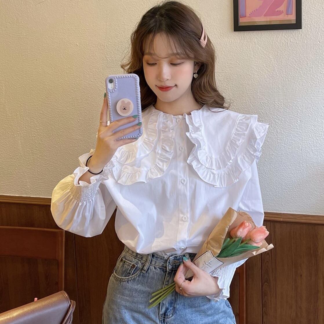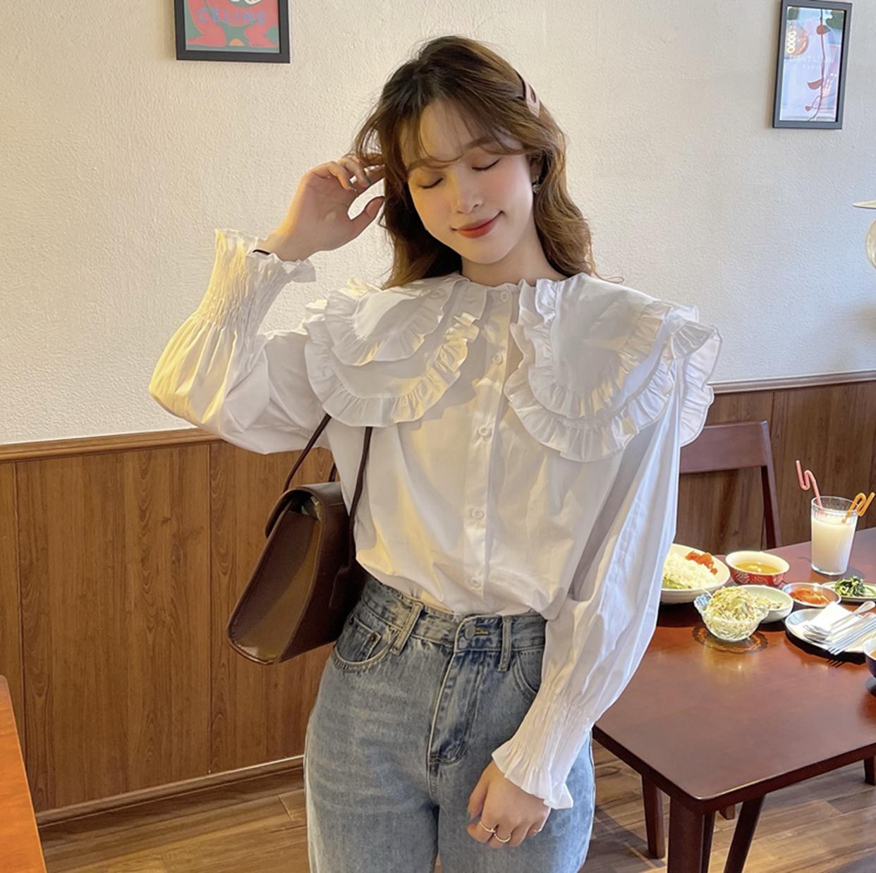 大きめ襟 長袖 フリル シャツ ブラウス トップス 白シャツ 白トップス ミディアム丈 袖あり パフスリーブ フレアスリーブ 襟付き かわいい 大人可愛い カジュアル 大人 おしゃれ お洒落 大人女子 ラブリー キュート ガーリー 個性的 主役級 存在感 無地 春 秋 10代 20代 レディース 通勤 学生 通学 デート お出かけ 女子会 休日 旅行 着回し 普段使い 重ね着 韓国 韓国系 オルチャン ゆったり サイズ S M L XL 色展開 白 ホワイト