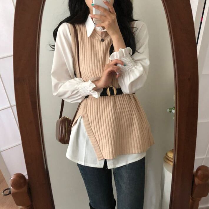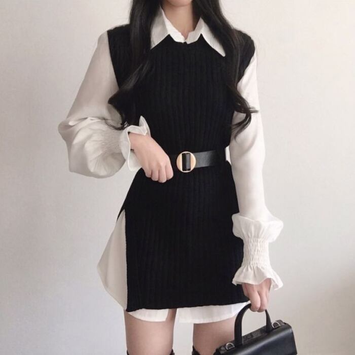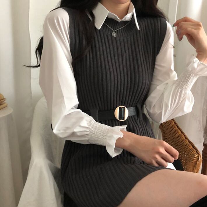 セットアップ 2点セット ベルト付き シャツ ブラウス レイヤード ニットワンピース トップス ワンピース ミニ ミニ丈 ノースリーブ 長袖 フレアスリーブ ラウンドネック 襟付き スリット ハイウエスト リブニット ニット ツーピース かわいい 大人可愛い きれいめ シンプル カジュアル 大人 おしゃれ お洒落 大人女子 無地 春 秋 10代 20代 レディース 通勤 学生 通学 デート お出かけ 女子会 休日 旅行 着回し 重ね着 韓国 フリーサイズ 色展開 黒 ブラック 灰色 グレー アプリコット