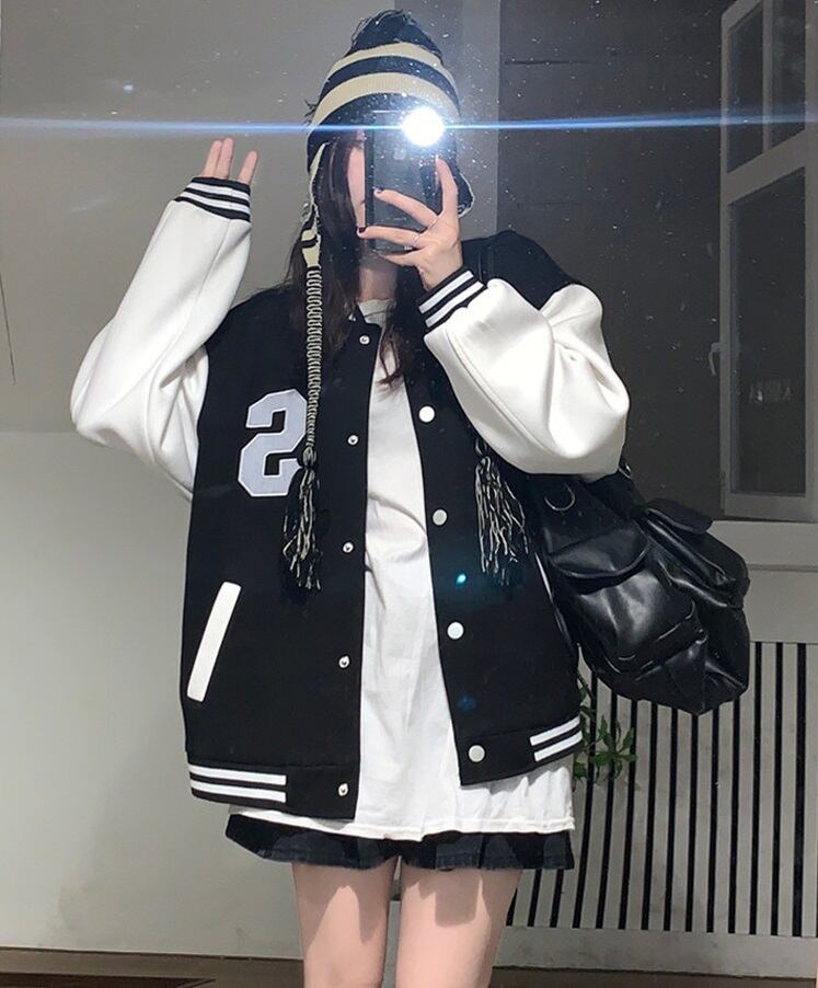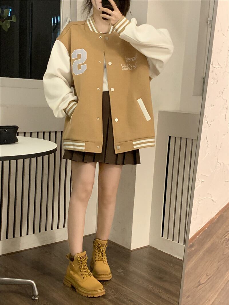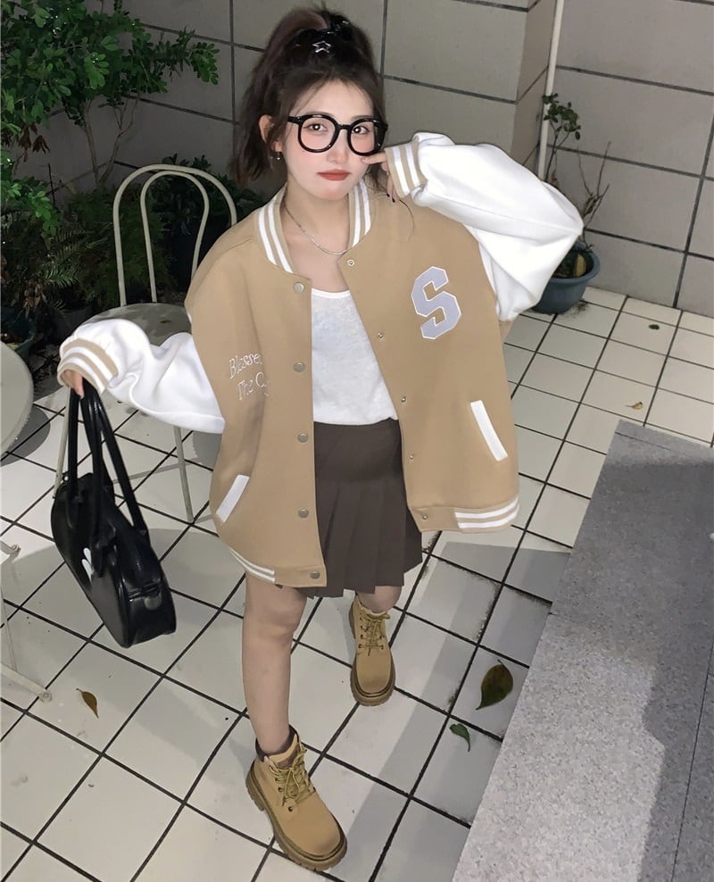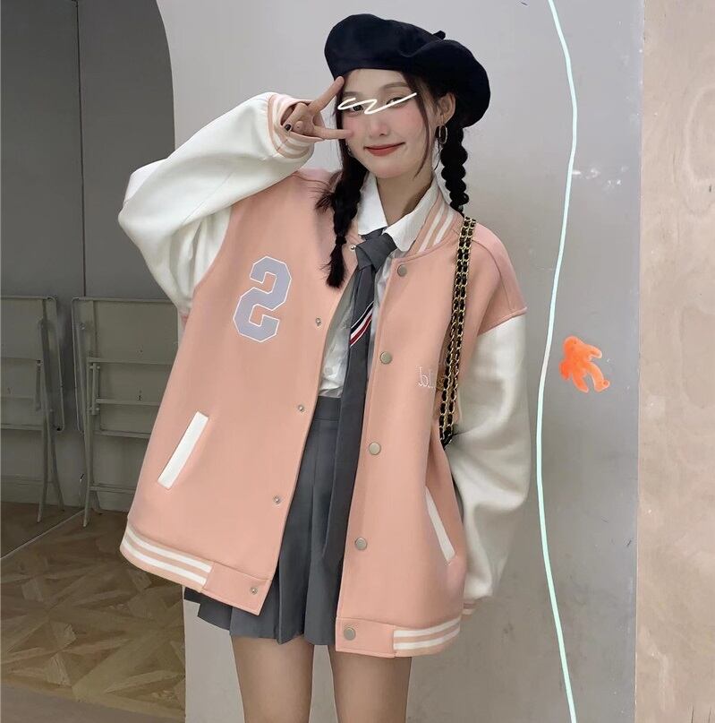 カラバリ カレッジ風 スポーティー ロゴ ジャケット アウター ブルゾン ミディアム丈 袖あり 長袖 ドロップショルダー 萌袖 スタンドカラー ポケット 前開き かわいい 大人可愛い カジュアル 大人 おしゃれ お洒落 かっこいい 大人女子 こなれ感 ボーイッシュ ルーズ 個性的 柄 春 秋 10代 20代 レディース 通勤 学生 デート お出かけ 女子会 休日 着回し 普段使い 重ね着 韓国 韓国系 オルチャン ゆったり ゆる サイズ M L 色展開 黒 ブラック カーキ ピンク