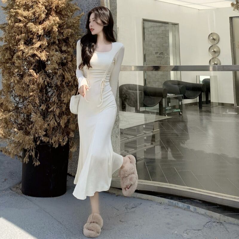 ミモレ丈 スクエアネック 長袖 ウエスト絞り フレアワンピース ワンピース ワンピドレス ミモレ 袖あり 襟なし フレア スリム 細身 Aライン 切り替えデザイン ハイウエスト かわいい 大人可愛い きれいめ シンプル カジュアル 大人 上品 おしゃれ お洒落 大人女子 エレガント 無地 春 秋 10代 20代 レディース 通勤 学生 通学 デート お出かけ 女子会 休日 旅行 着回し 普段使い 重ね着 韓国 韓国系 オルチャン 大きいサイズ S M L XL 2XL 色展開 ベージュ