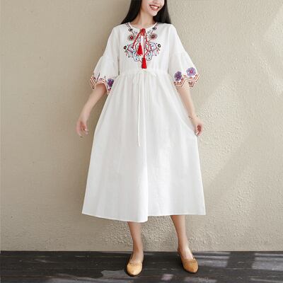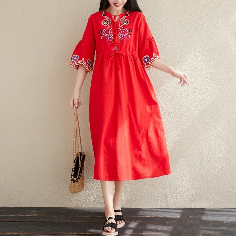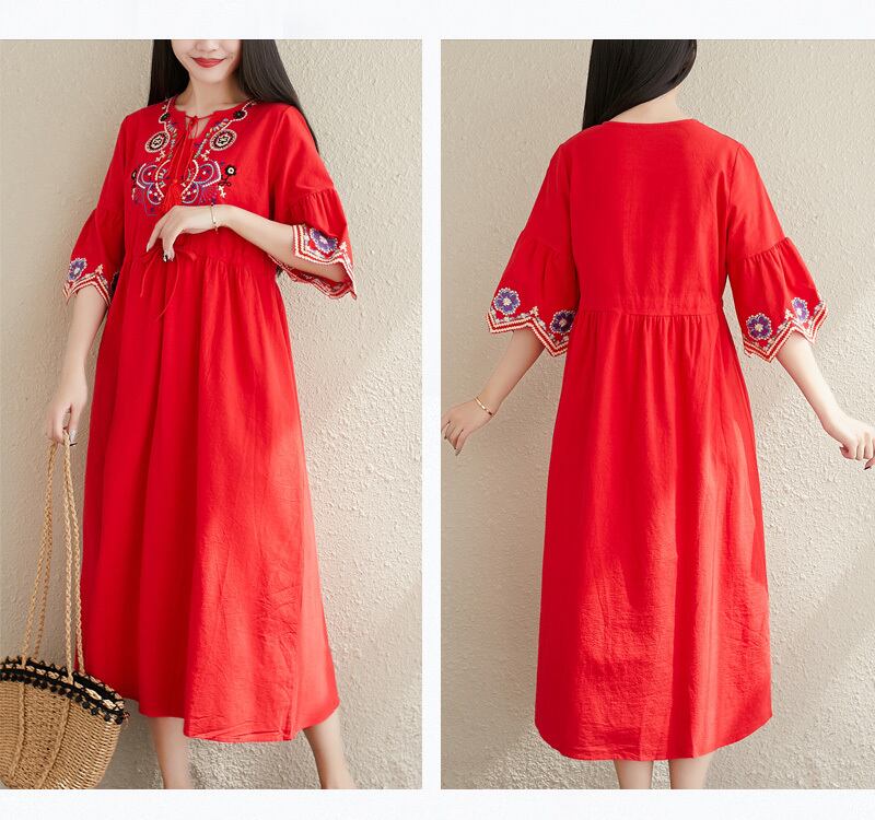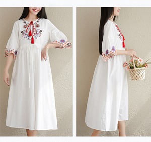 刺繍フレアスワンピース ワンピース フレアワンピース 膝丈 ひざ丈 ミモレ ミモレ丈 袖あり 5分袖 五分袖 ラウンドネック フレア Aライン 刺繍 切り替えデザイン ハイウエスト 綿 麻 リネン かわいい 大人可愛い きれいめ シンプル カジュアル 大人 上品 おしゃれ お洒落 アジアン エスニック 大人可愛い 大人女子 こなれ感 キュート ガーリー 個性的 モダン 主役級 存在感 無地 春 夏 秋 10代 20代 30代 レディース 学生 通学 デート お出かけ 女子会 休日 リゾート 旅行 着回し