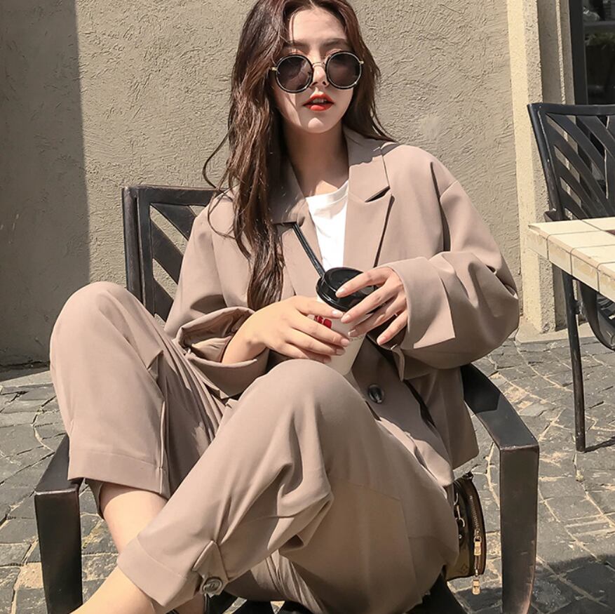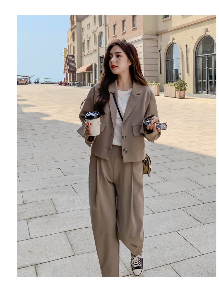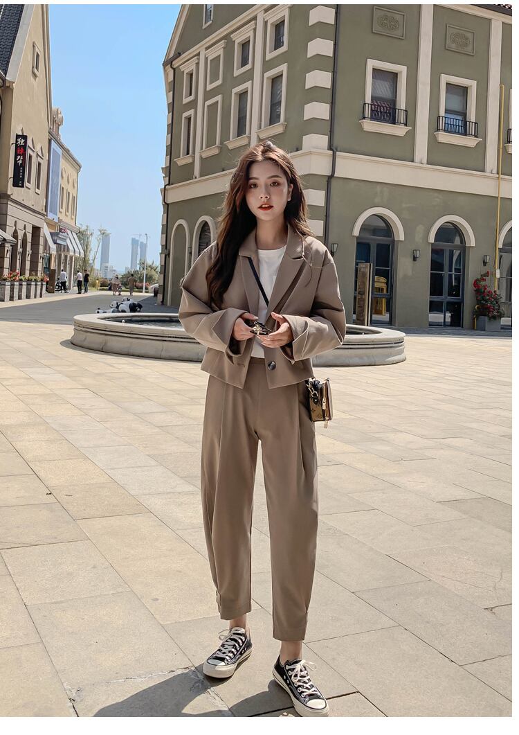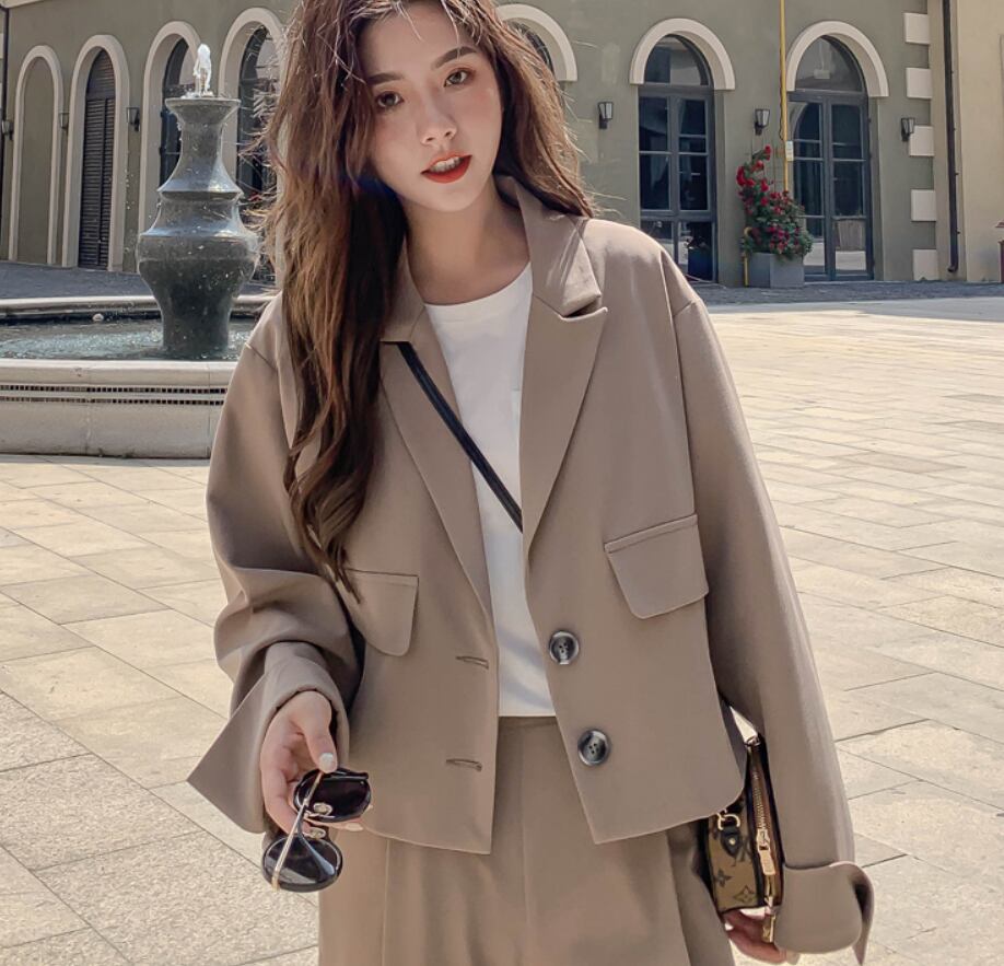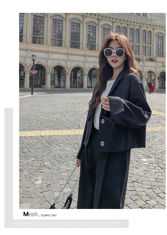 短めの丈のジャケットとハイウエストのズボンのセットアップ。ゆったりシルエットで体形カバー。それぞれでも使えて着回し力高めなアイテムです。