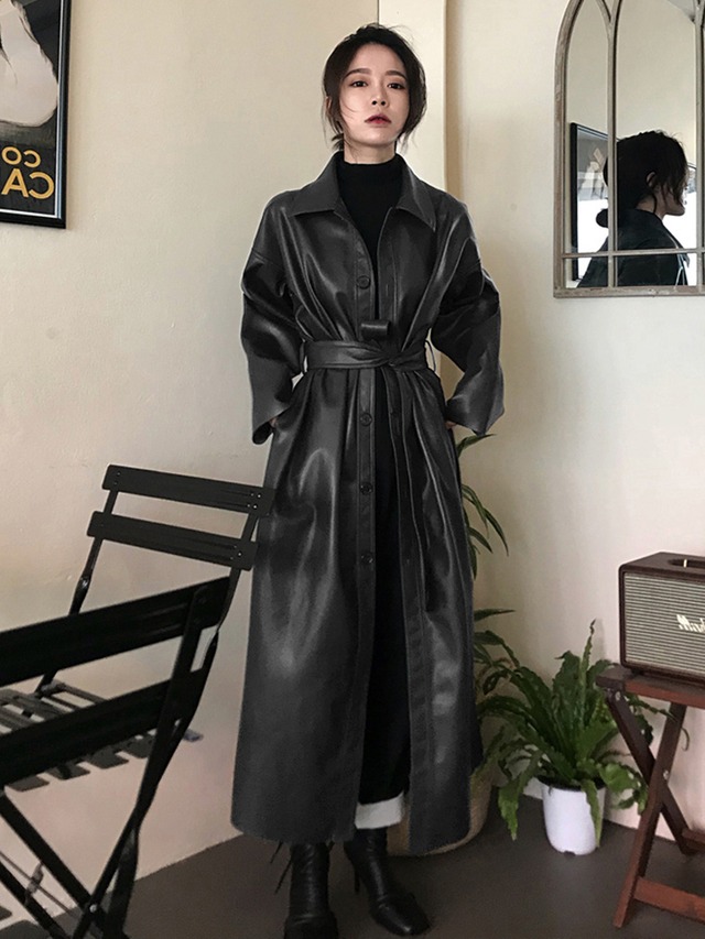 アウター ジャケット レザージャケット レディース ロング ロングコート ネクタイ ウインドブレーカージャケット ポロカラー ルーズタイプ ハンサム クール 個性的 大人 上品 おしゃれ お洒落 かっこいい メンズライク マニッシュ こなれ感 モード系 セクシー エレガント モダン 主役級 存在感 フォーマル オフィス ビジネス OL 通勤 学生 通学 デート お出かけ 着回し 普段使い 韓国 オルチャン ファッション コーデ スタイル インスタ映え プレゼント ギフト モテ 春 秋 冬 S M L XL