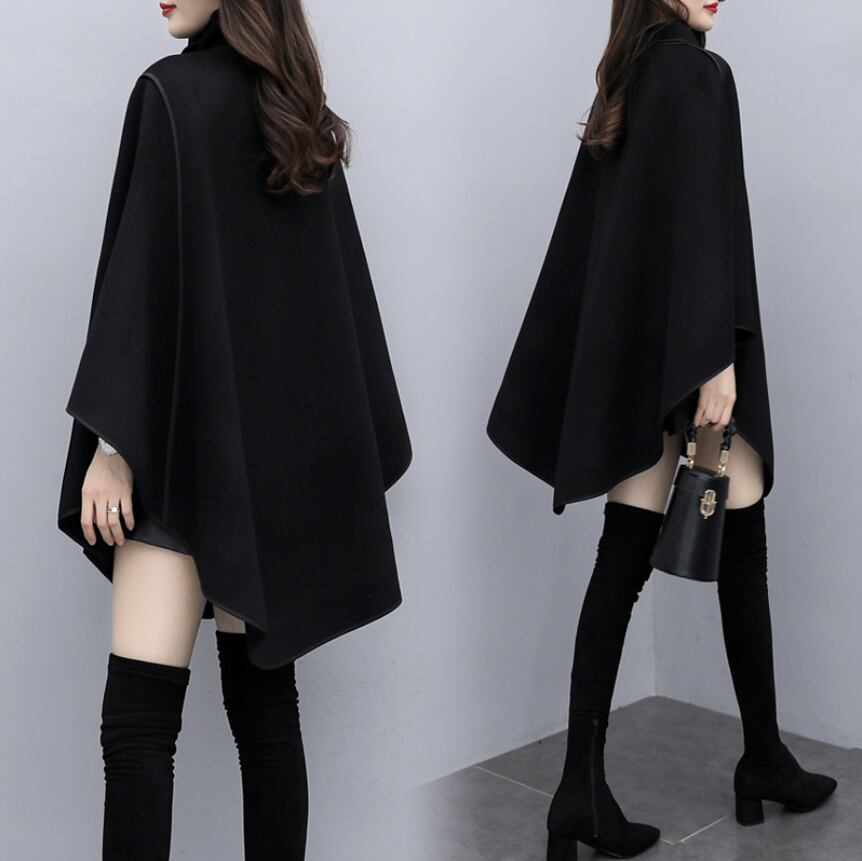 アウター マント ケープ コート ミドル丈 長袖 襟付き ワイド Aライン アシンメトリー ウール 大人可愛い 大人 上品 おしゃれ お洒落 かっこいい レトロ ガーリー 個性的 エレガント 無地 秋 冬 10代 20代 30代 レディース デート お出かけ ファッション モテ サイズ S M L XL ブラック