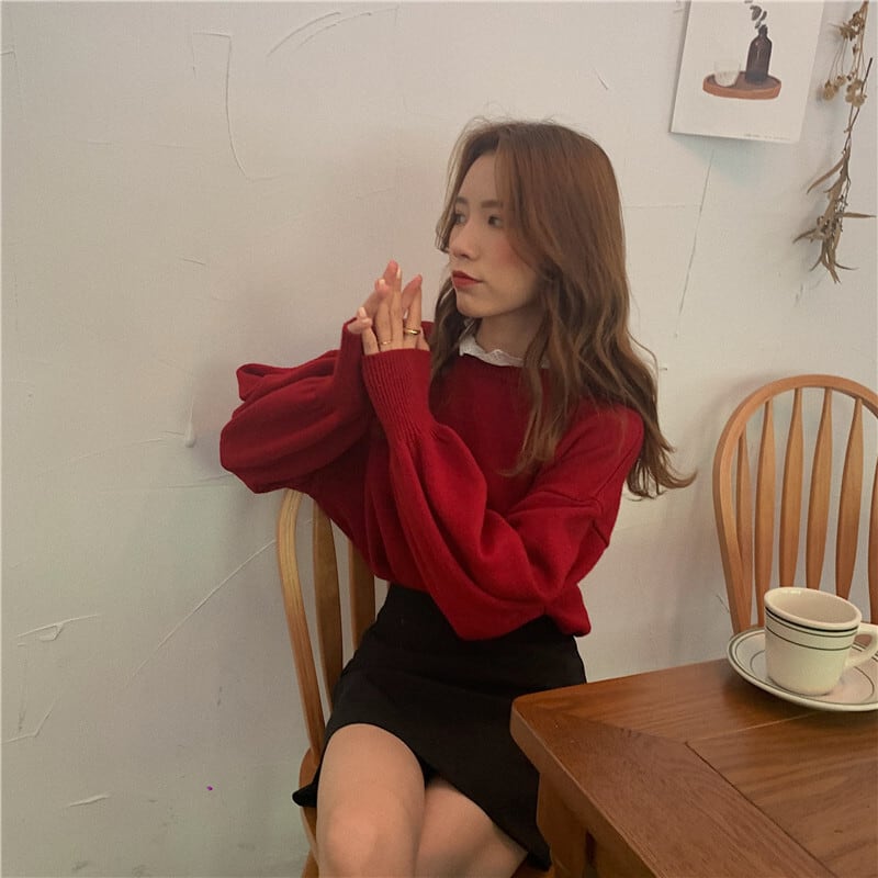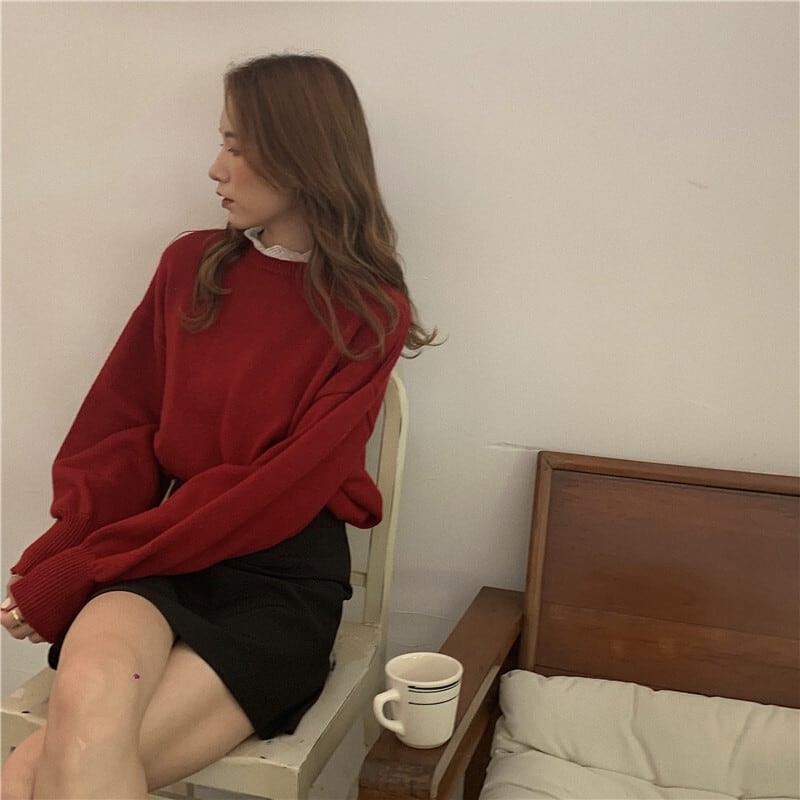 トップス ニットソー セーター 袖あり 長袖 ボリューム袖 ラウンドネック 襟なし もこもこ モコモコ ふわふわ ニット かわいい 大人可愛い シンプル カジュアル 大人 上品 おしゃれ 大人可愛い 大人女子 無地 秋 冬 10代 20代 レディース S M L XL 赤 レッド ベージュ