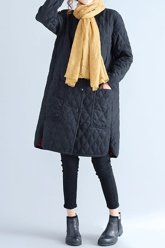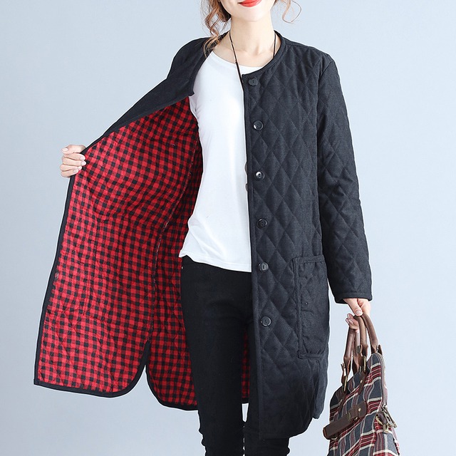 アウター コート ロングコート キルティングコート 袖あり 長袖 襟なし ふわふわ 綿 かわいい 大人可愛い シンプル カジュアル 大人 おしゃれ 格子柄 春 秋 冬 10代 20代 30代 レディース 着回し 普段使い 重ね着 L XL 大きめ ビッグサイズ ゆったり ゆる 黒 ブラック