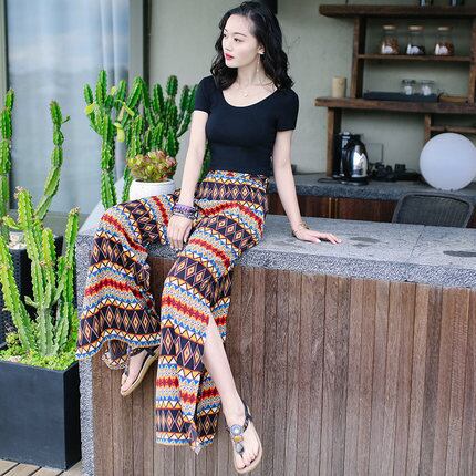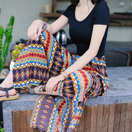 ボヘミアンな雰囲気満点のカラフルなネイティブ柄がお洒落なワイドパンツ。