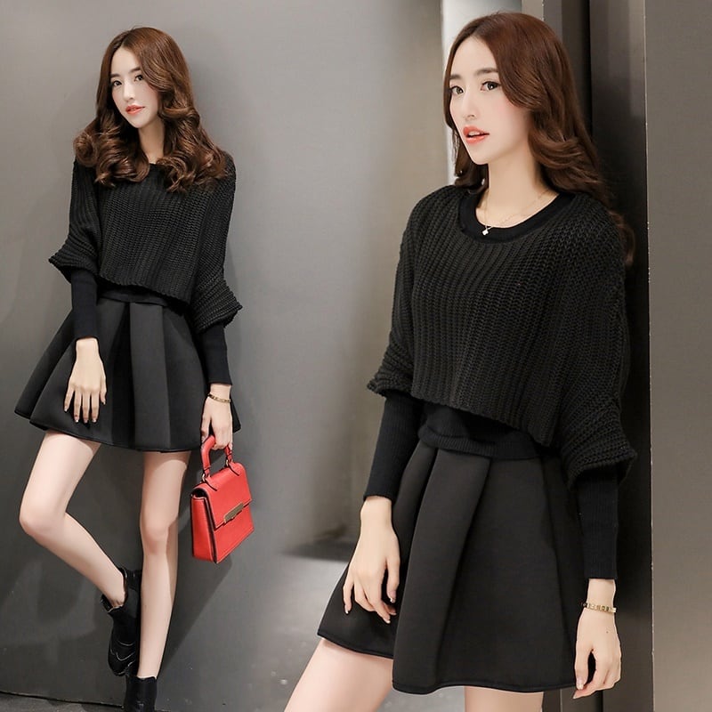 短め丈のニットと立体的なフレアミニスカートが美シルエットなワンピースのセット。