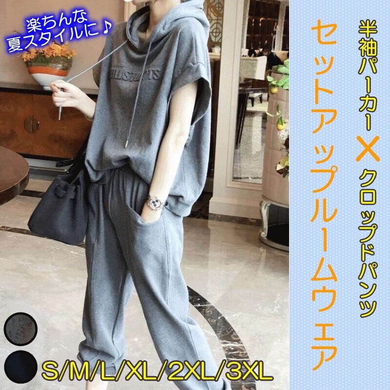 セットアップ ルームウェア パジャマ 上下セット トップス ボトムス 2点セット ツーピース トップス パーカー パンツ ズボン ロゴ 半袖 袖あり ドロスト ドローストリング フード付き ポケット 裾絞り クロップドパンツ ゆったり ゆる ルーズ かわいい 可愛い カジュアル ボーイッシュ スポーティー スポーツ 運動 寝巻き 部屋着 ナイトウェア お泊り デート 旅行 休日 レディース 女の子 学生 10代 20代 夏 大きいサイズ S M L XL 2XL 3XL ライトグレー 灰色 ブラック 黒