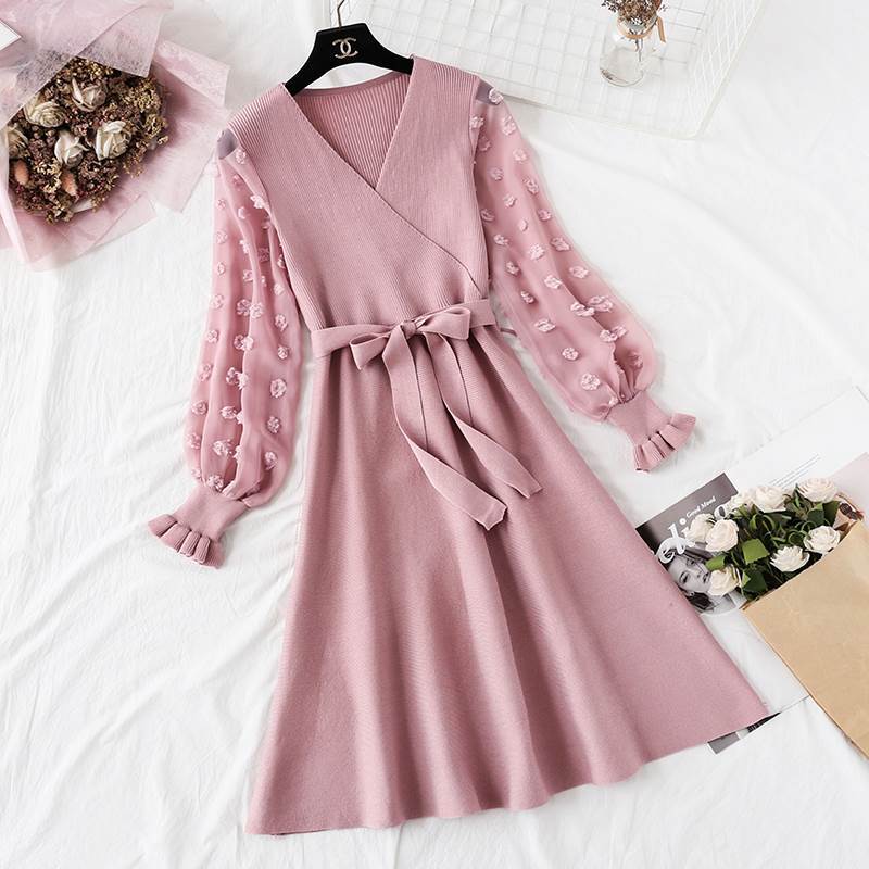 袖シースルーニットワンピース ワンピース フレアワンピース 袖あり 長袖 Vネック Aライン シフォン ウエストマーク ウエストリボン かわいい 大人可愛い きれいめ シンプル おしゃれ お洒落 大人可愛い 大人女子 ラブリー キュート ガーリー 無地 ドット柄 水玉 春 夏 秋 10代 20代 30代 レディース 学生 通学 デート お出かけ 女子会 休日 普段使い 韓国 韓国系 オルチャン サイズ S M L XL 色展開 黒 ブラック ベージュ ピンク
