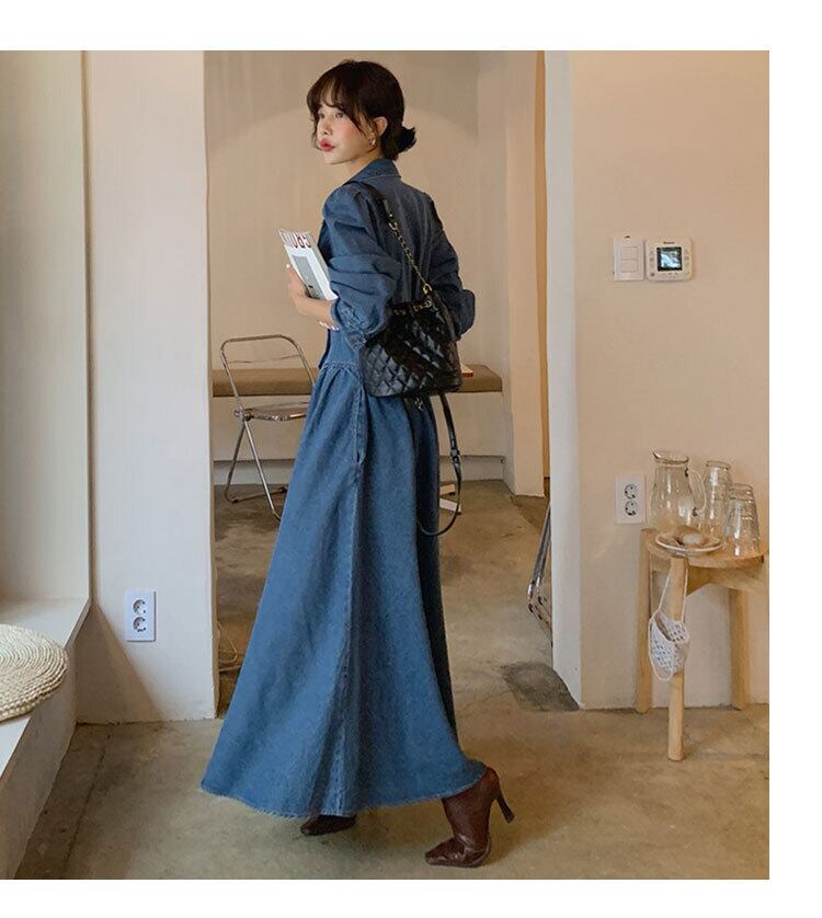 デニムロングワンピース ワンピース フレアワンピース デニムワンピース ロング ロング丈 袖あり 長袖 Vネック 襟付き フレア Aライン ハイウエスト 綿 かわいい 大人可愛い きれいめ シンプル カジュアル 大人 上品 おしゃれ お洒落 かっこいい レトロ 大人可愛い 大人女子 こなれ感 ラブリー キュート ガーリー モダン 主役級 存在感 無地 春 秋 10代 20代 30代 レディース 学生 通学 デート お出かけ 女子会 着回し 普段使い 重ね着 サイズ S M L XL 色展開 青 ブルー