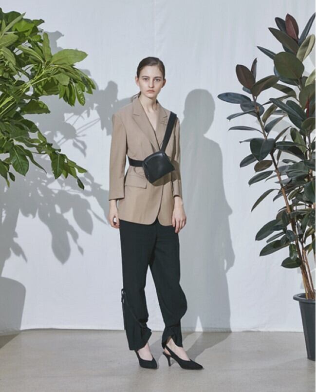 フェイクレザーとの異素材使いとEMODAのオリジナル金具ロゴがポイント。