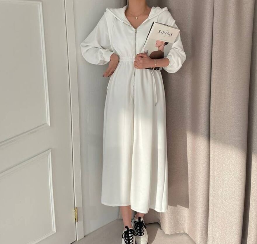 ワンピース フーディー スウェット ミモレ ミモレ丈 袖あり 長袖 襟なし ストレート ウエストマーク フード付き ファスナー ポケット ハイウエスト 前開き ウエストゴム 伸縮性 薄手 かわいい 大人可愛い シンプル カジュアル 大人 おしゃれ お洒落 大人可愛い 大人女子 こなれ感 ラフ ルーズ 個性的 主役級 存在感 とろみ感 抜け感 無地 春 秋 誕生日 ハロウィン 10代 20代 30代 40代 50代 60代 レディース 女性用 ママ マタニティ オフィス ビジネス OL 通勤 学生 通学